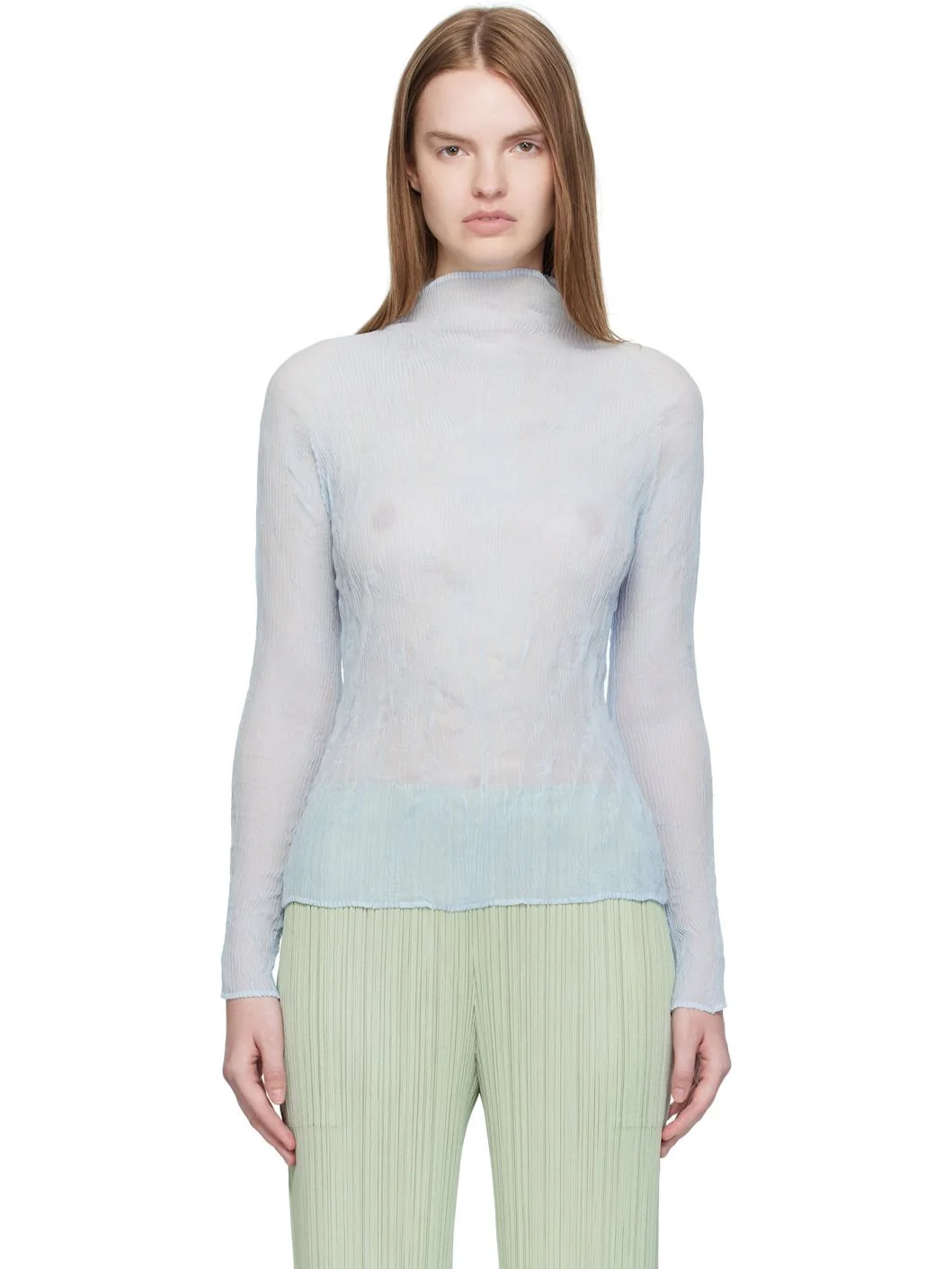 Sheer garment-pleated recycled polyester chiffon top. · Turtleneck · Raglan sleeves Supplier color: Nigella blue 100% polyester. Made in Japan 252809F099007