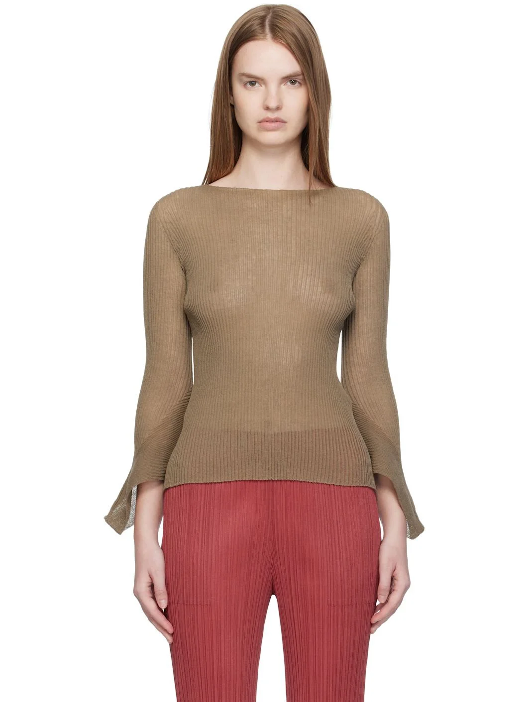 Semi-sheer rib-knit sweater. · Boatneck · Modified bell sleeves Supplier color: Greige 77% polyester, 23% ramie. Made in Japan 252809F096000