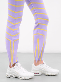 ISSEY MIYAKE purple pants, knit construction, stripe pattern, high-elastic waist, slight flared cuffs, semi-fitted. Made in Japan 100% Wool Japanese Sizing Model is 5'10" wearing size 2. Bust: 31" Waist: 23.5" Hips: 35"
