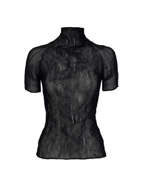 This high-neck, short-sleeved top is characterized by its sheerness and is made from recycled polyester fabric that is pleated and twisted. The size of this product varies slightly from item to item. Please note this in advance. Product Information Material: 100% polyester Country of origin: Japan neckline/collar:high neck