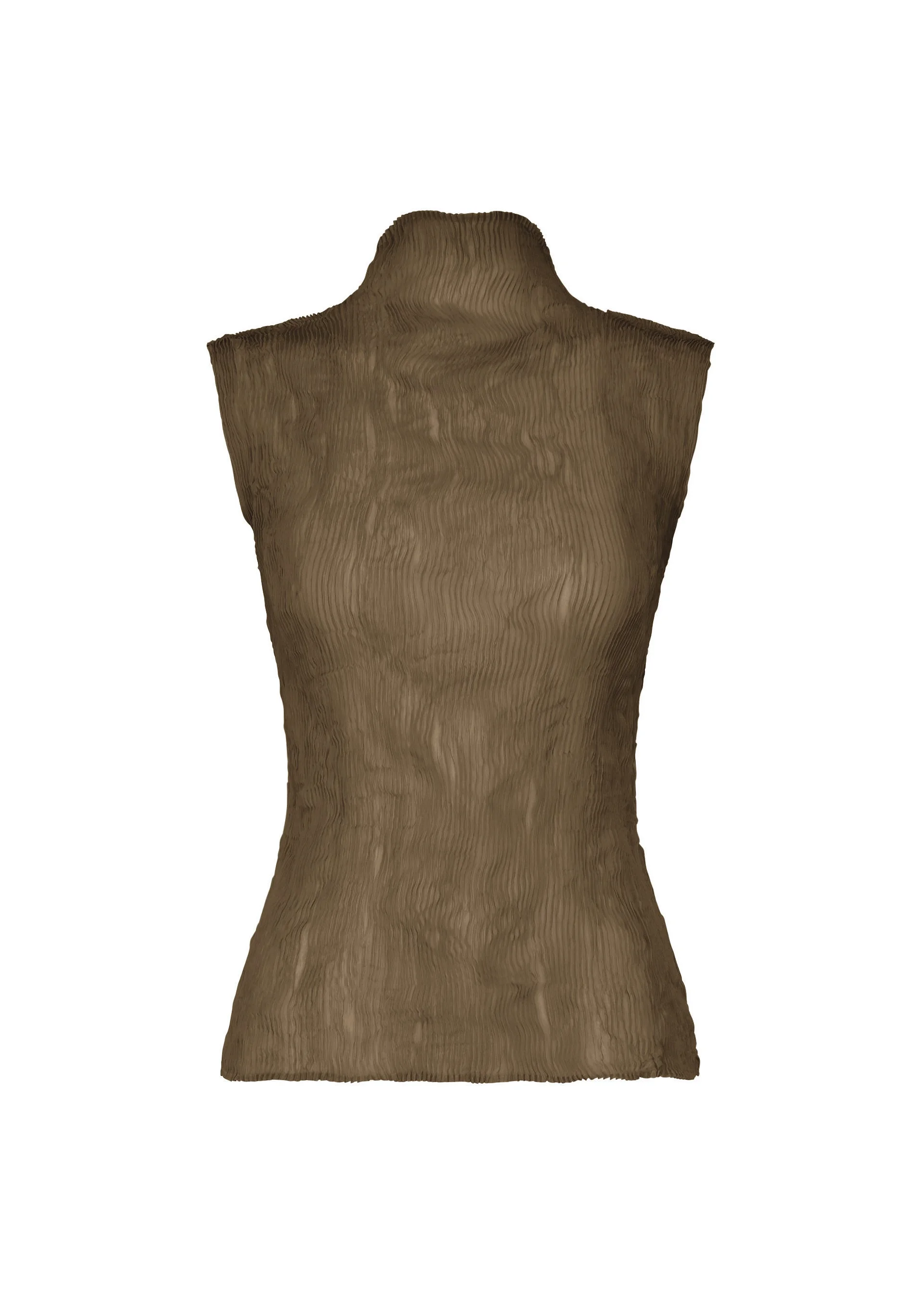 This high-neck sleeveless top is made from recycled polyester fabric that has been pleated and twisted, creating a distinctive sheer effect. The size of this product varies slightly from item to item. Please note this in advance. Product Information Material: 100% polyester Made in Japan Neckline / Collar:High Neck