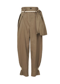 These pants are characterized by their wound cotton cord design that makes you sense the handwork. The fabric combines the sleek texture and tautness of linen with the stretchiness of nylon and polyurethane. Made from a single pattern, the pants are boldly given tucks and strongly wrapped with the cotton cord, creating a rich silhouette that leverages the tautness of the material. Product Information Material: 62% linen, 32% nylon, 6% polyurethane, cord: 100% cotton Country of origin: Japan Waist specifications:button/belt loop Front opening specification:zip fly Pocket (position):both sides accessories:belt