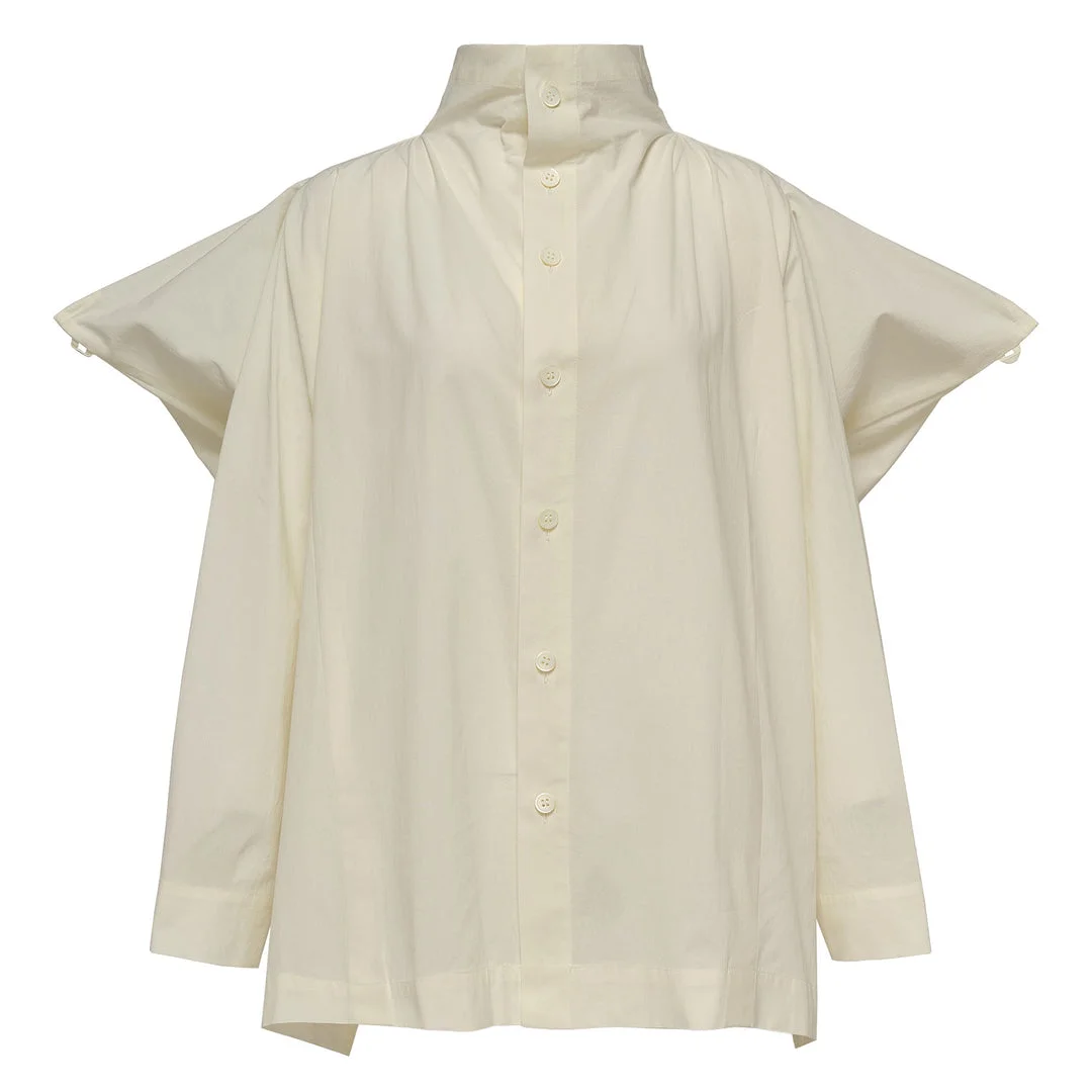 600061854OWT003 / IM56FJ506/00/06/FEB - High mock neck collar with button closure - Dramatic cape sleeves with extended proportions - Full button front placket - Long fitted sleeves underneath cape layer - Premium cotton voile construction - Architectural oversized fit - Asymmetrical hem length ISSEY MIYAKE Cotton Voile Shirt delivers Japanese minimalist design with innovative construction and architectural silhouette. Crafted from premium cotton voile in cream, featuring an elevated high neckline and dramatic cape-like sleeves that create sculptural movement. The brand's signature experimental approach to form and function transforms a classic shirt into a contemporary statement piece.