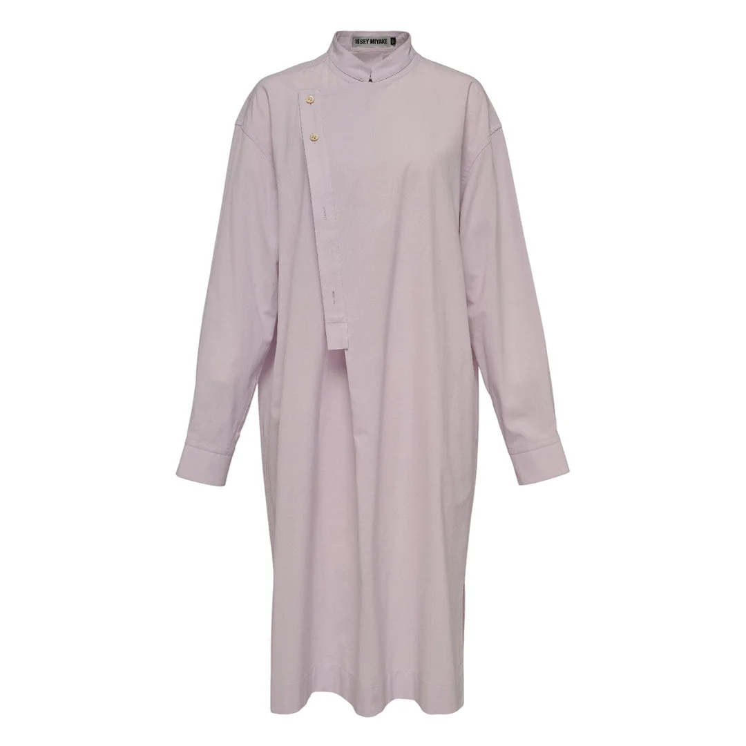 600061829PUR002 / IM56FH508/00/85/FEB - High mandarin collar with pleated detail - Asymmetrical button placket closure - Long sleeves with button cuffs - Lightweight cotton voile construction - Relaxed oversized fit - Midi length hemline - Side seam pockets The ISSEY MIYAKE Cotton Voile Shirt Woven Dress delivers minimalist sophistication with architectural design elements. Crafted from lightweight cotton voile in soft lavender gray, featuring an asymmetrical button placket and high mandarin collar with signature pleating details. The relaxed silhouette and innovative construction showcase the brand's commitment to functional art and wearable design.