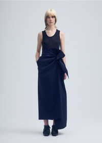 Featuring bold, lightweight silhouettes that can be styled creatively in many ways, ENCLOTHE is a woven series featuring textured washi paper blended with stretch fabric. Inspired by the core concept of A Piece of Cloth, ENCLOTHE's elegant draping wraps comfortably around the body in fluid forms. This long skirt has an asymmetrical, draped fit with a folded waistband. It includes one right side pocket and one back left pocket. It includes a ceramic, stone-like detail that adjusts the waist. Product Code: IM48-FG457 Material: 70% Paper, 25% Nylon, 5% Polyurethane (Woven) / Clasp : Ceramic Care: Do not wash. Do not bleach. Do not tumble dry. Cool iron. Dryclean any solvent, short cycle.
