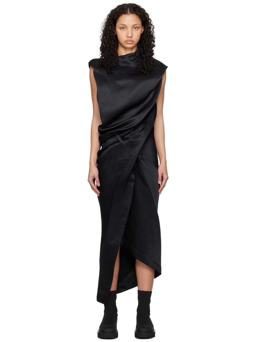 Paper- and polyester-blend sateen dress. Draping throughout. · Asymmetrical construction · Round neck · Concealed adjustable button drawstring · Zip vent at side seam · Unlined · Logo-engraved silver-tone hardware Supplier color: Black