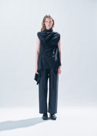 Crafted from a lightweight fabric with two-way stretch, EYE OF THE BEAN is a woven series featuring rounded shirring to produce elegant silhouettes. This sleeveless shirt has an asymmetrical fit, a draped neckline, and a fabric detail that wraps gently around the neck. It includes elegant shirring at the waist. Product Code: IM46-FJ536 Material: 69% Nylon, 31% Polyurethane (Woven) / Embroidery Yarn: 90% Polyester, 10% Polyurethane Care: Hand wash cold. Only non-chlorine bleach, when needed. Do not tumble dry. Line dry in the shade. Cool iron. Do not dryclean.