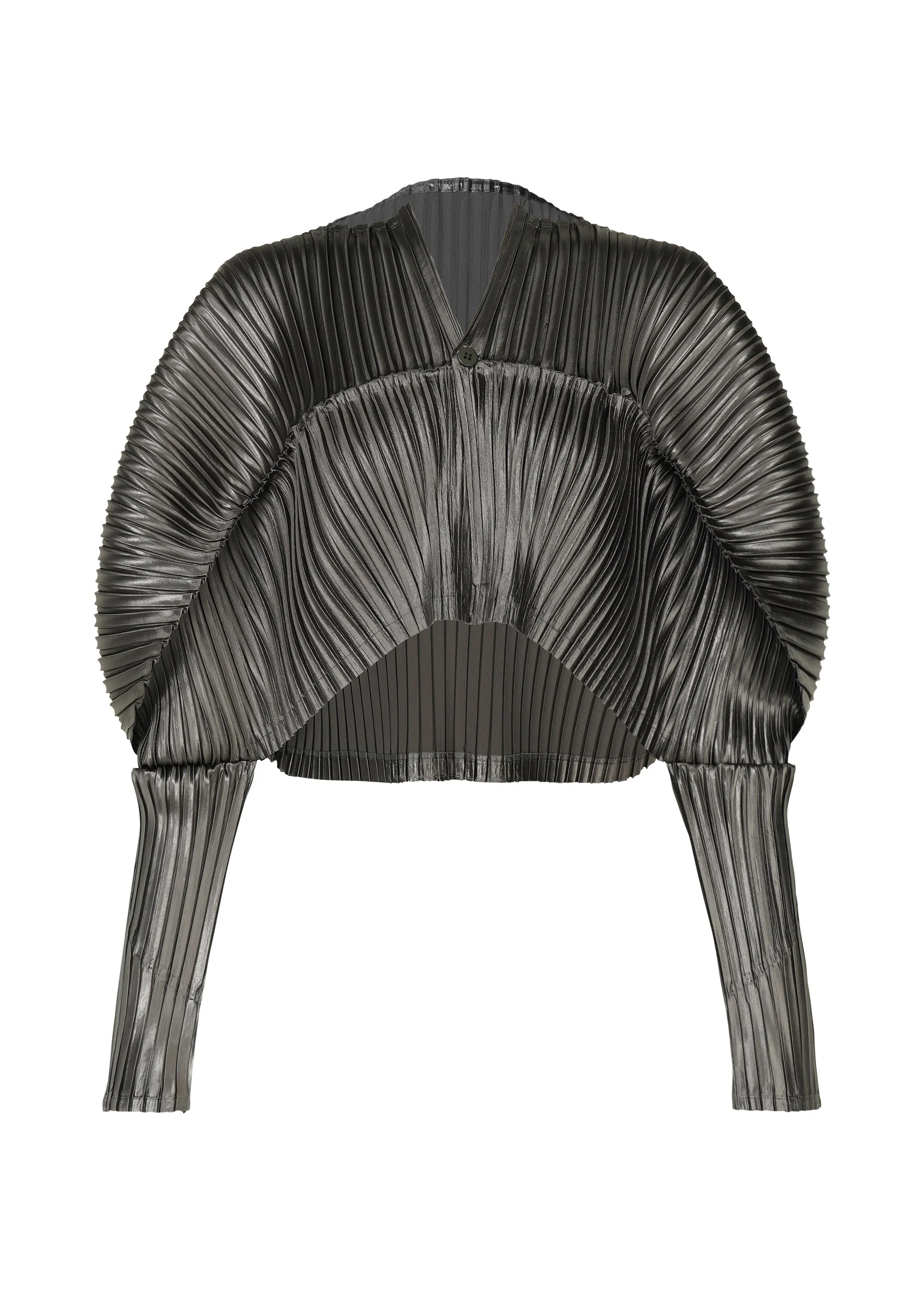 This cardigan is characterized by its texture that shines just like metal. After applying a vintage finish to polyester satin to create a soft texture and wrinkling, a calendering process is used to add luster to the fabric, resulting in a unique shine and depth. The design sits moderately away from the body, highlighting the material's luster. Product Information Material: 100% polyester Made in Japan Neckline / Collar:No collar / V-neck Front opening:button