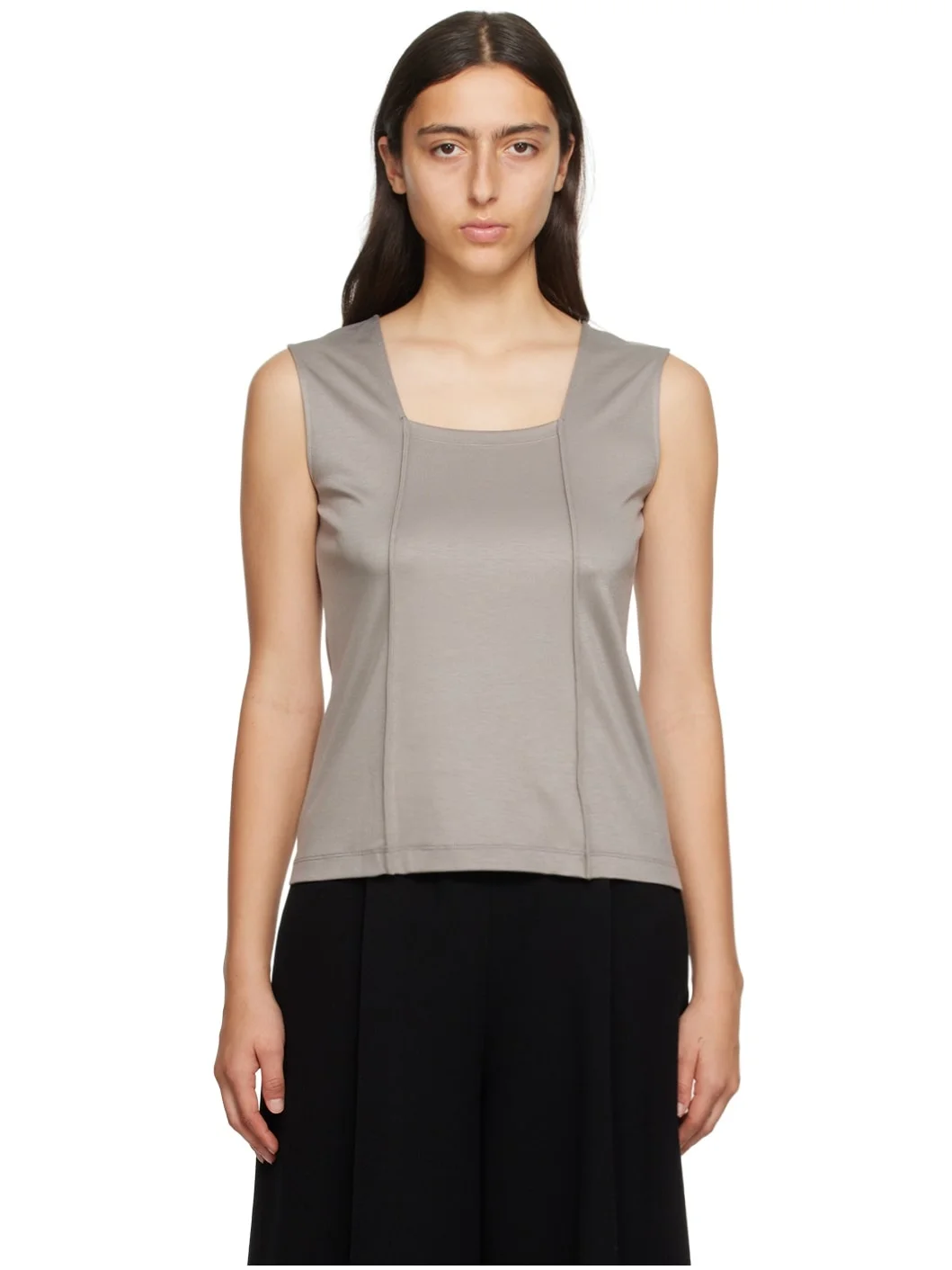 Stretch rayon-blend jersey tank top. · Scoop neck · Pinched seams at front and back Supplier color: Gray 66% rayon, 31% nylon, 3% polyurethane. Made in Japan 232809F111000