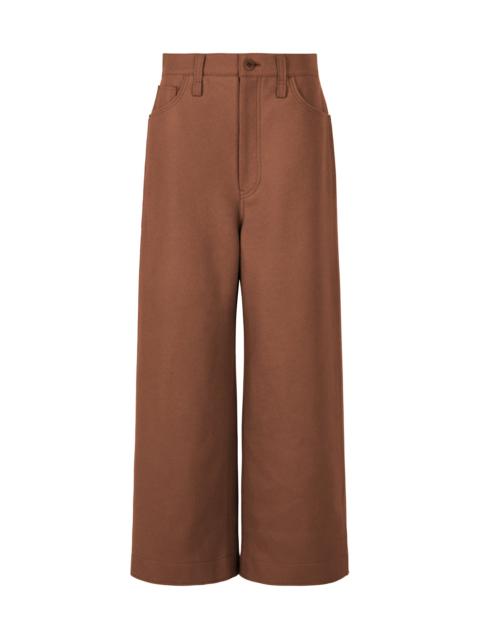 These pants are characterized by their form reminiscent of a garment bag. Featuring thick cords at the shoulders, yoke, and hem, the series features items with a form that gives the impression of wearing a garment bag. The highly expressive jersey fabric, made from a blend of polyester spun thread and wool thread, is fully resin-coated and pressed to add gloss and a taut feel. The lightweight, puffy material is deliberately processed to create a fabric with an entirely different look. Product Information Material: 80% polyester, 20% wool (polyurethane coating) Made in Japan Waist specifications:Buttons / Belt loops Front opening specification:Zip fly Pocket (position):Front and back, both sides others:Drawcord (hem)