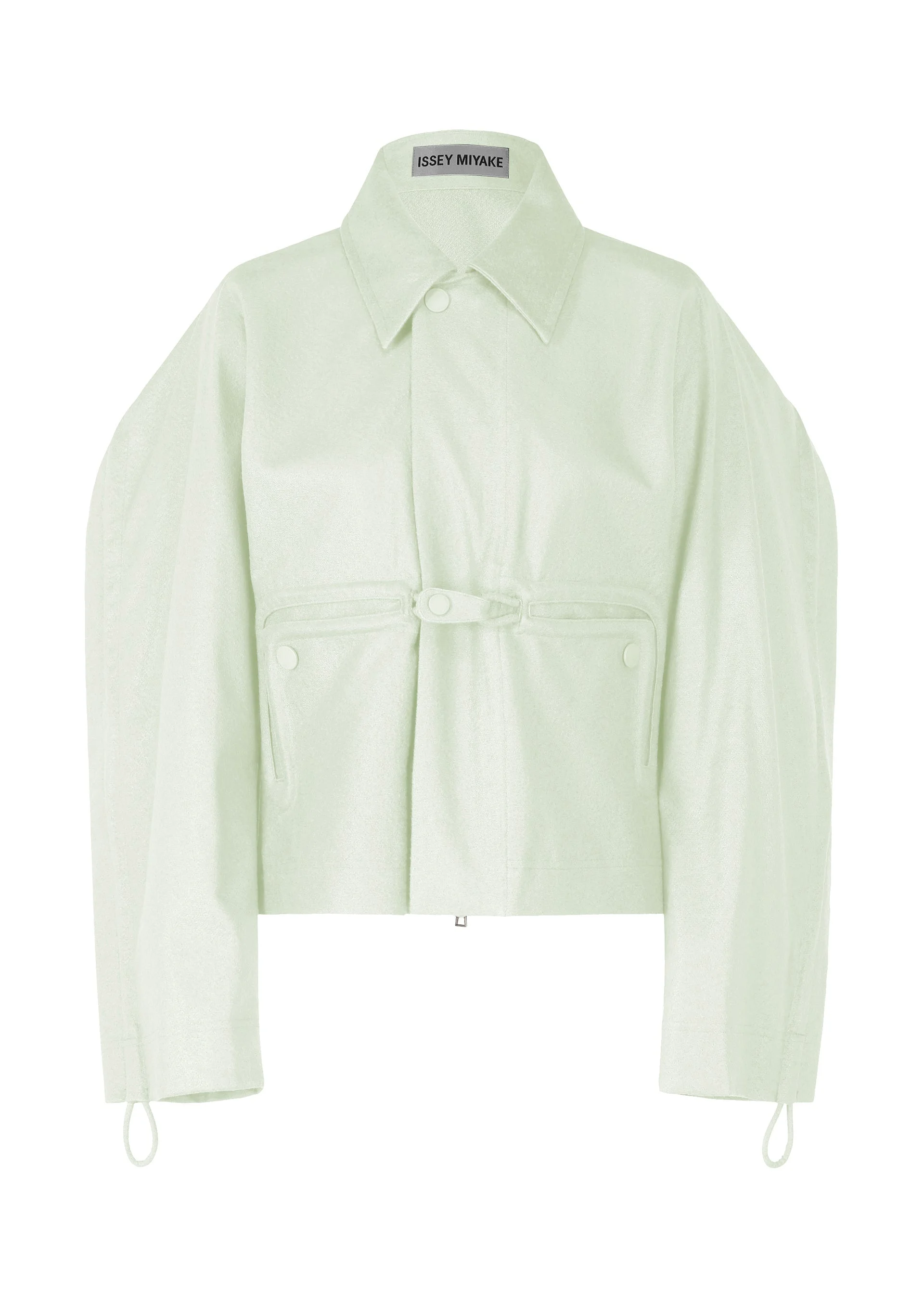 This jacket is characterized by its form reminiscent of a garment bag. Featuring thick cords at the shoulders, yoke, and hem, the series features items with a form that gives the impression of wearing a garment bag. The highly expressive jersey fabric, made from a blend of polyester spun thread and wool thread, is fully resin-coated and pressed to add gloss and a taut feel. The lightweight, puffy material is deliberately processed to create a fabric with an entirely different look. Product Information Material: 80% polyester, 20% wool (polyurethane coating) Made in Japan Neckline / Collar:Regular Color Front opening:Button/Zip-up Pocket (position):Both sides others:Drawcord (sleeve)