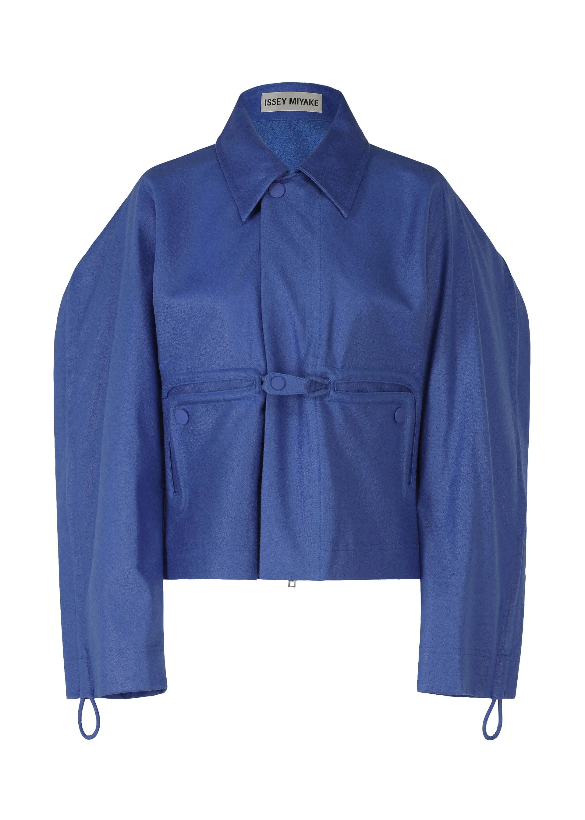 This jacket is characterized by its form reminiscent of a garment bag. Featuring thick cords at the shoulders, yoke, and hem, the series features items with a form that gives the impression of wearing a garment bag. The highly expressive jersey fabric, made from a blend of polyester spun thread and wool thread, is fully resin-coated and pressed to add gloss and a taut feel. The lightweight, puffy material is deliberately processed to create a fabric with an entirely different look. Product Information Material: 80% polyester, 20% wool (polyurethane coating) Made in Japan Neckline / Collar:Regular Color Front opening:Button/Zip-up Pocket (position):Both sides others:Drawcord (sleeve)
