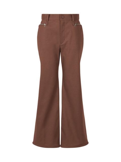 These pants are characterized by their form reminiscent of a garment bag. Featuring thick cords at the shoulders, yoke, and hem, the series features items with a form that gives the impression of wearing a garment bag. The highly expressive jersey fabric, made from a blend of polyester spun thread and wool thread, is fully resin-coated and pressed to add gloss and a taut feel. The lightweight, puffy material is deliberately processed to create a fabric with an entirely different look. Product Information Material: 80% polyester, 20% wool (polyurethane coating) Made in Japan Waist specifications:Buttons / Belt loops Front opening specification:Zip fly Pocket (position):Front and back, both sides others:Drawcord (hem)