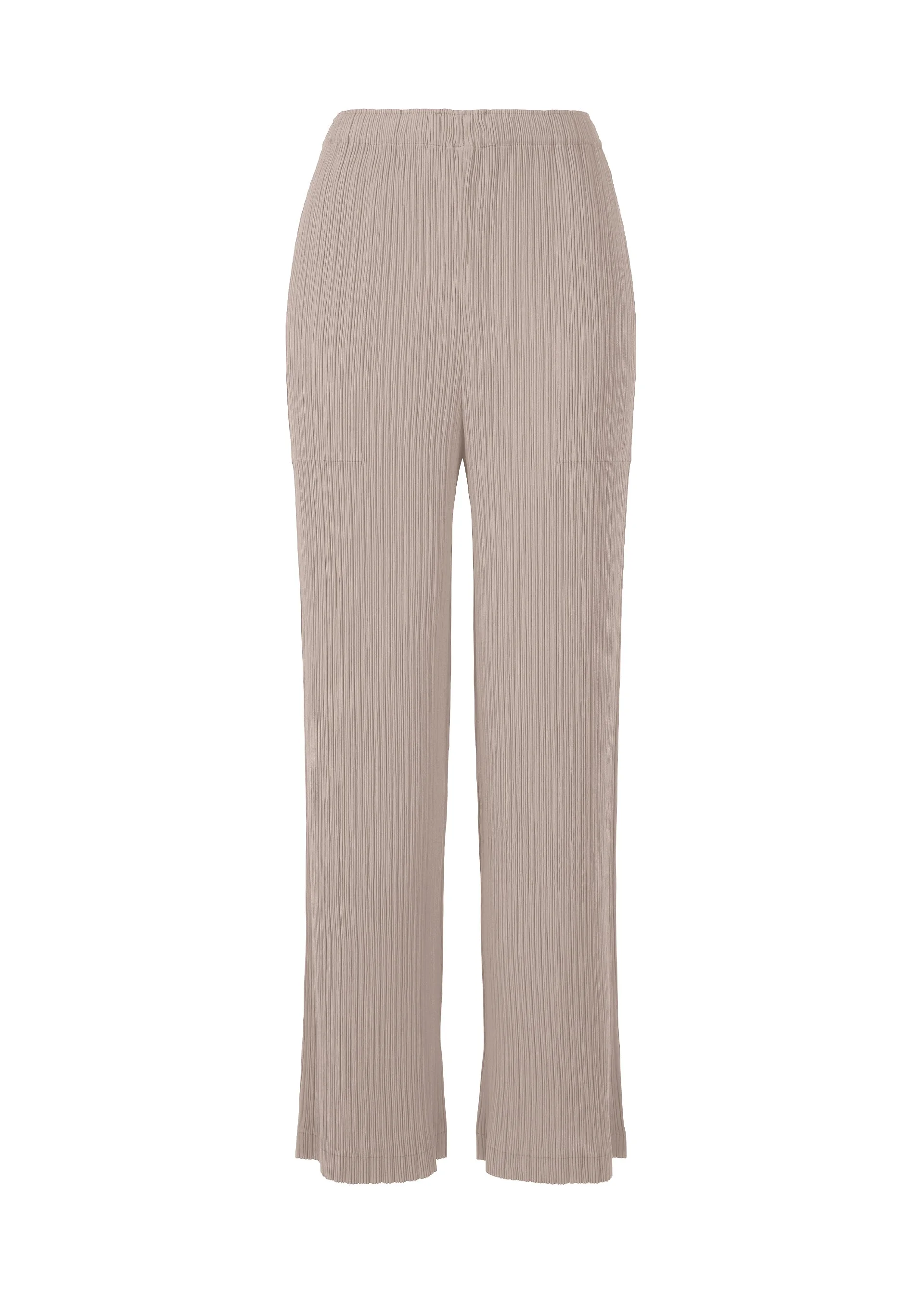These pleated straight pants are characterized by the appearance of hatching, which looks like a scratched drawing. It is made from recycled polyester with a textured finish created by applying fine pleats twice. The pants' texture is dry to the touch, and they are recommended for daily use. Product Information Material: 100% Polyester Made In Japan Waist specifications:Rubber Pocket (position):Both sides
