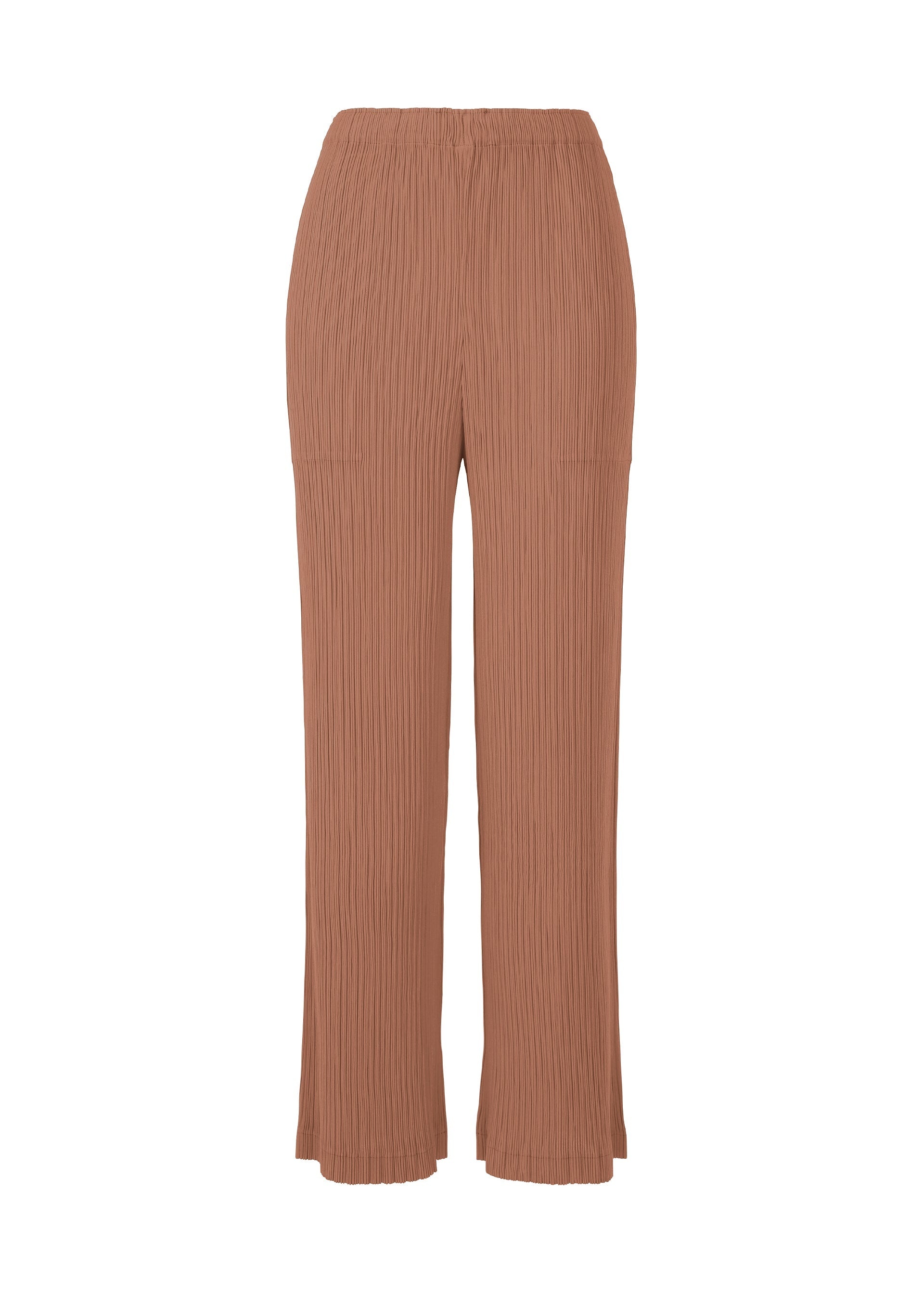 Offered in fall colors, HATCHING PLEATS is a twice pleated series with a matte, dry-touch finish. These pleated pants have a straight leg, elastic waistband, and two side pockets. Product Code: IM48-FF121 Material: 100% Polyester (Woven) Care: Machine wash cold, gentle cycle. Only non-chlorine bleach, when needed. Do not tumble dry. Line dry in the shade. Do not iron. Do not dryclean.