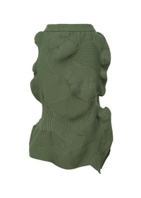 A knit skirt with an uneven feel, knitted by combining different textures like kneading clay together. It is characterized by a curved and deep form created by combining different tissues with a linear pattern.