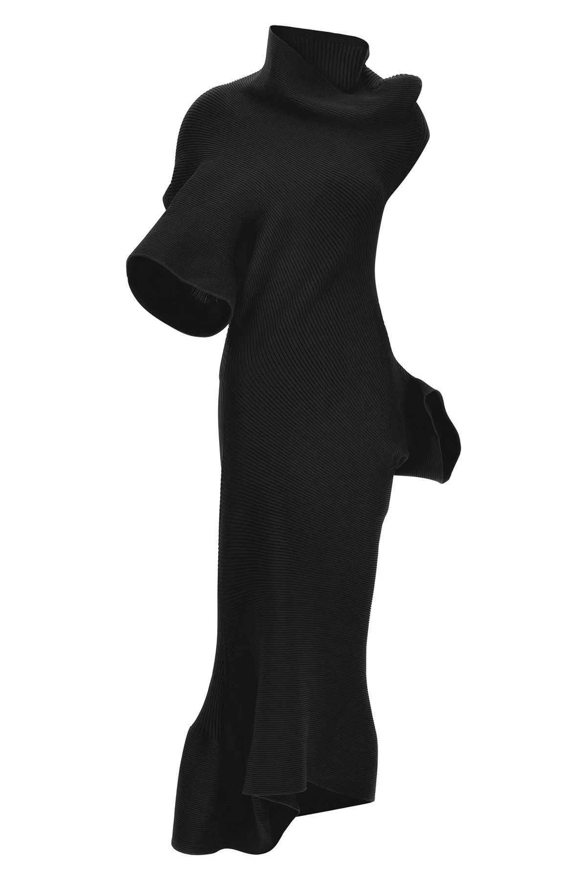 cod. IM66KH81215 Life form' stretch knit midi dress with ribbed pattern, tubular shapes, asymmetric, wide high and beveled neck, tubular insert with opening on the side, wider on the hem, short sleeves. Color: Black Size & Fit: True to size fit Composition: 100% polyester Made in: Japan