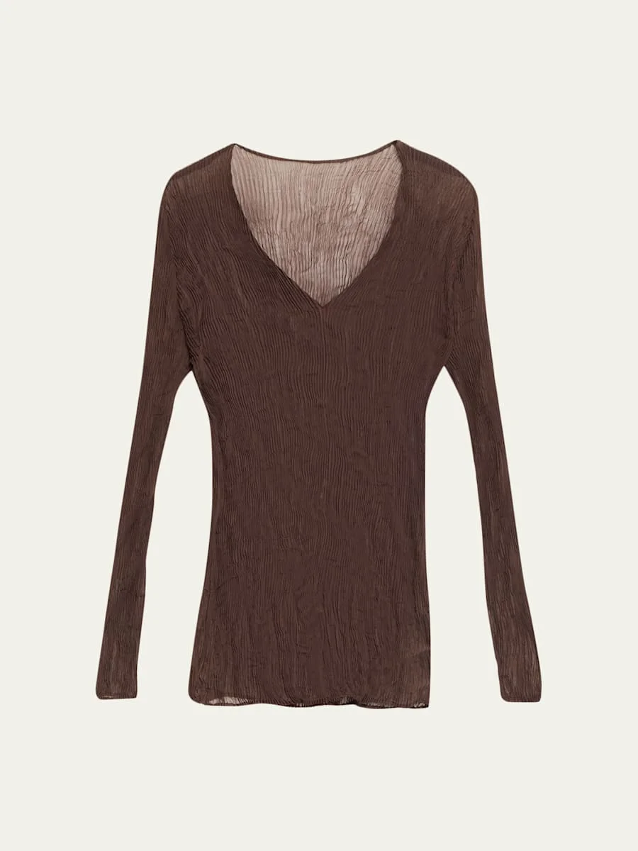 Long-Sleeve Sheer Pleated V-Neck Shirt