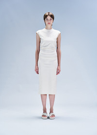 Made from a soft paper and cotton blend that molds comfortably to the body, MEMBRANE features snug silhouettes in neutral colors. This mid-length dress has a slim fit with cap sleeves and a back zipper. Product Code: IM46-FH502 Material: 42% Paper, 34% Nylon, 15% Cotton, 9% Polyurethane (Woven) Care: Hand wash cold. Only non-chlorine bleach, when needed. Do not tumble dry. Line dry in the shade. Cool iron. Dryclean, petroleum solvent only, short cycle.