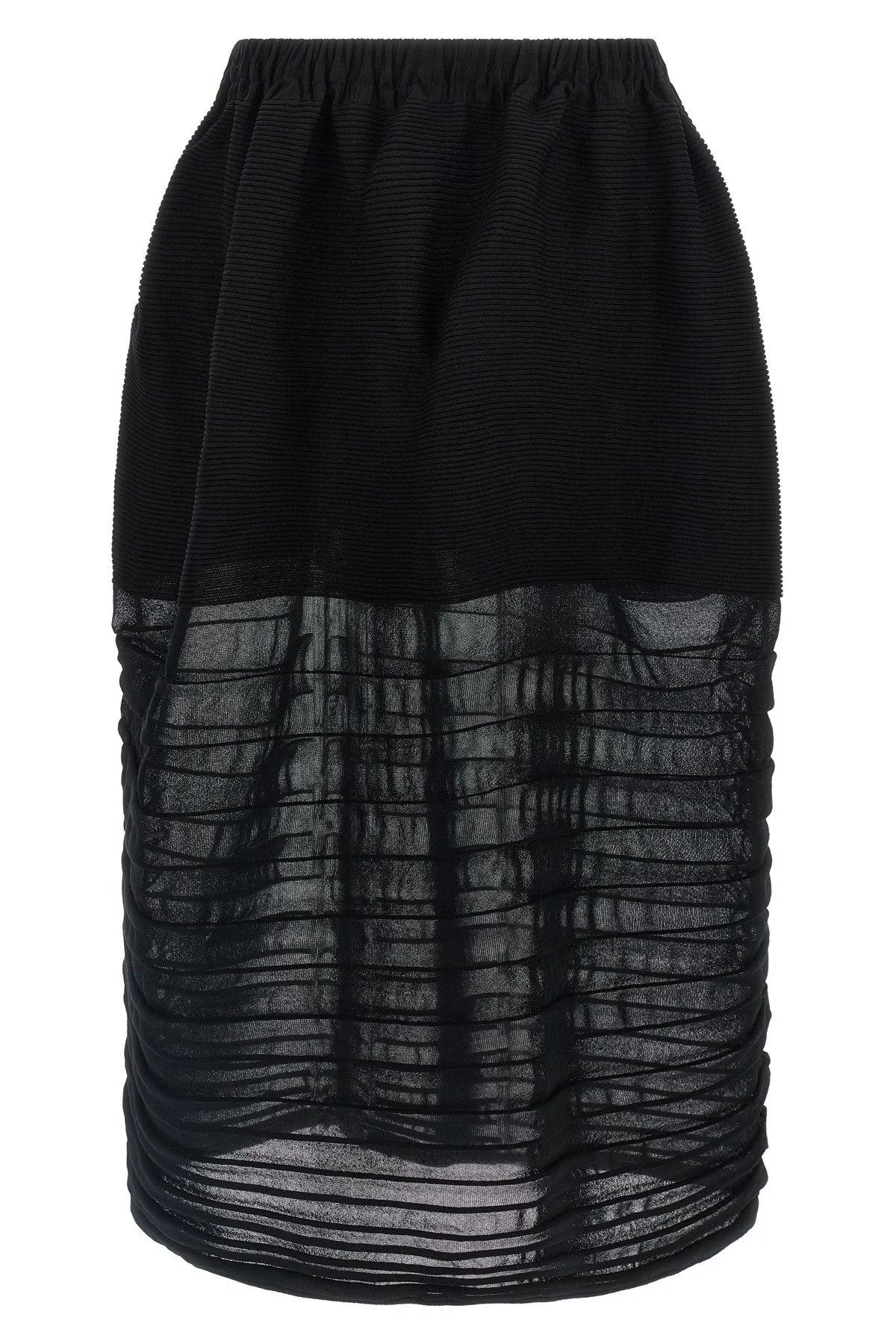 cod. IM58KG31115 'Moving Knit' fabric midi skirt with contrasting knit structures that create a light and elastic texture, bell silhouette, elastic waistband, pockets. Color: Black Size & Fit: true to size fit Composition: 44% polyester 30% cu, 26% co Made in: Japan