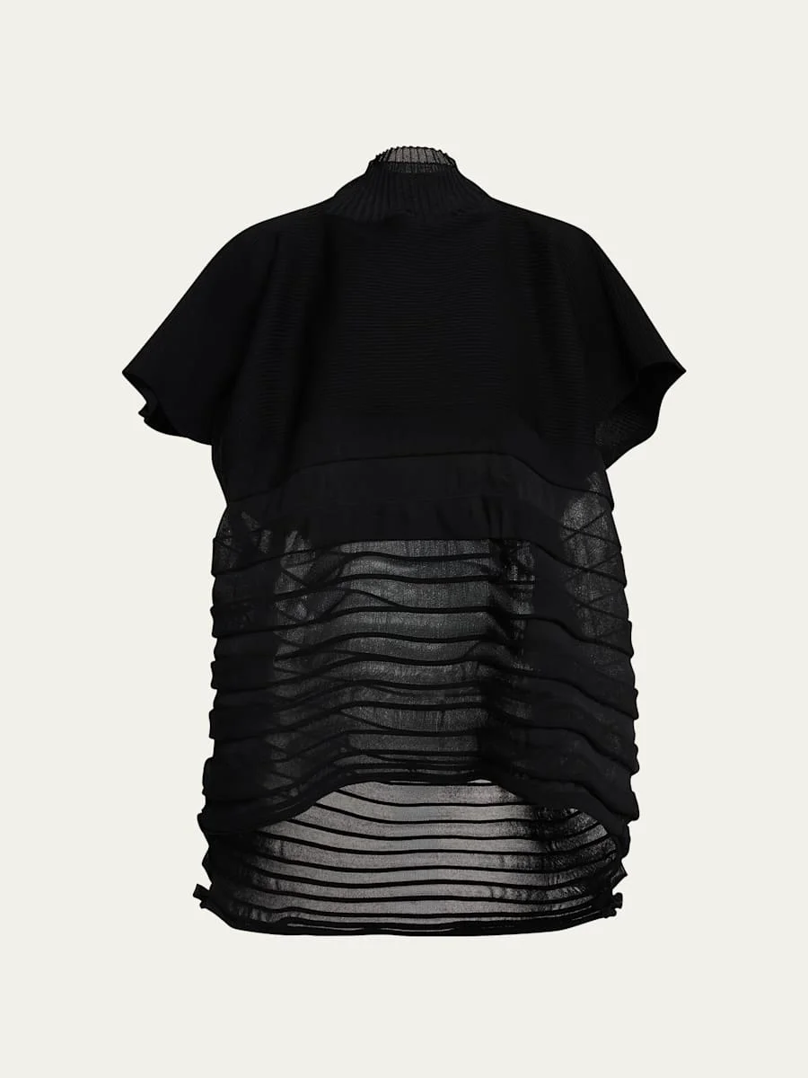 Crafted from horizontal ribbed knit, this top from Issey Miyake features a pleated sheer moving knit panel Mock neckline Short sleeves Oversized fit Hem falls below the hip Pullover style Polyester/cotton/cupro Made in Japan SIZE amp; FITModel measurements: 5'10" tall Model is wearing a US size 4/Small
