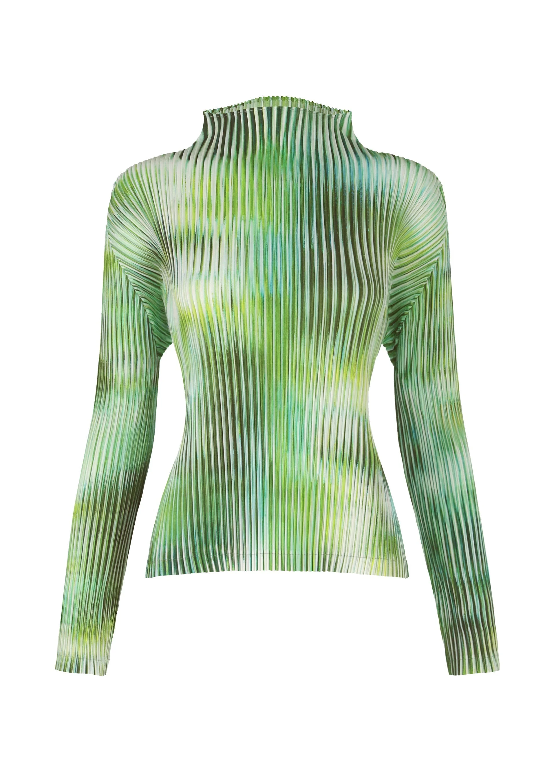 This high-neck, long-sleeved top is printed with an original moire-style pattern. The pattern is created using photographs of various everyday scenes, overlaid with a striped frosted glass filter. The moire effect is achieved by applying pleats to the fabric with its striped patterns from the frosted glass. The base is made with a polyester material woven with thread resembling spun yarn, characterized by its natural, dry-touch texture. Enjoy the smooth feel and striking pattern. The pattern of this product varies from item to item. Please note this in advance. Product Information Material: 100% Polyester Made In Japan Neckline / Collar:Bottleneck