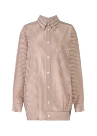 This long-sleeved shirt features a unique design where the basic shirt bodice transforms into sleeves. By fastening the front placket and sides with buttons, half the body transforms into sleeves. You can enjoy distorted styling by putting your arms through the front and back sleeves, or tie the created sleeves together — freely arrange it according to your mood. Dyeing the warp threads in four-color gradations creates blurred stripe pattern outlines and ambiguous boundaries. Product Information Material: 44% Polyester, 29% Wool, 27% Cotton Made in Japan Neckline / Collar:Regular Color Front opening:button Pocket (position):left chest others:Buttons (both sides/back)