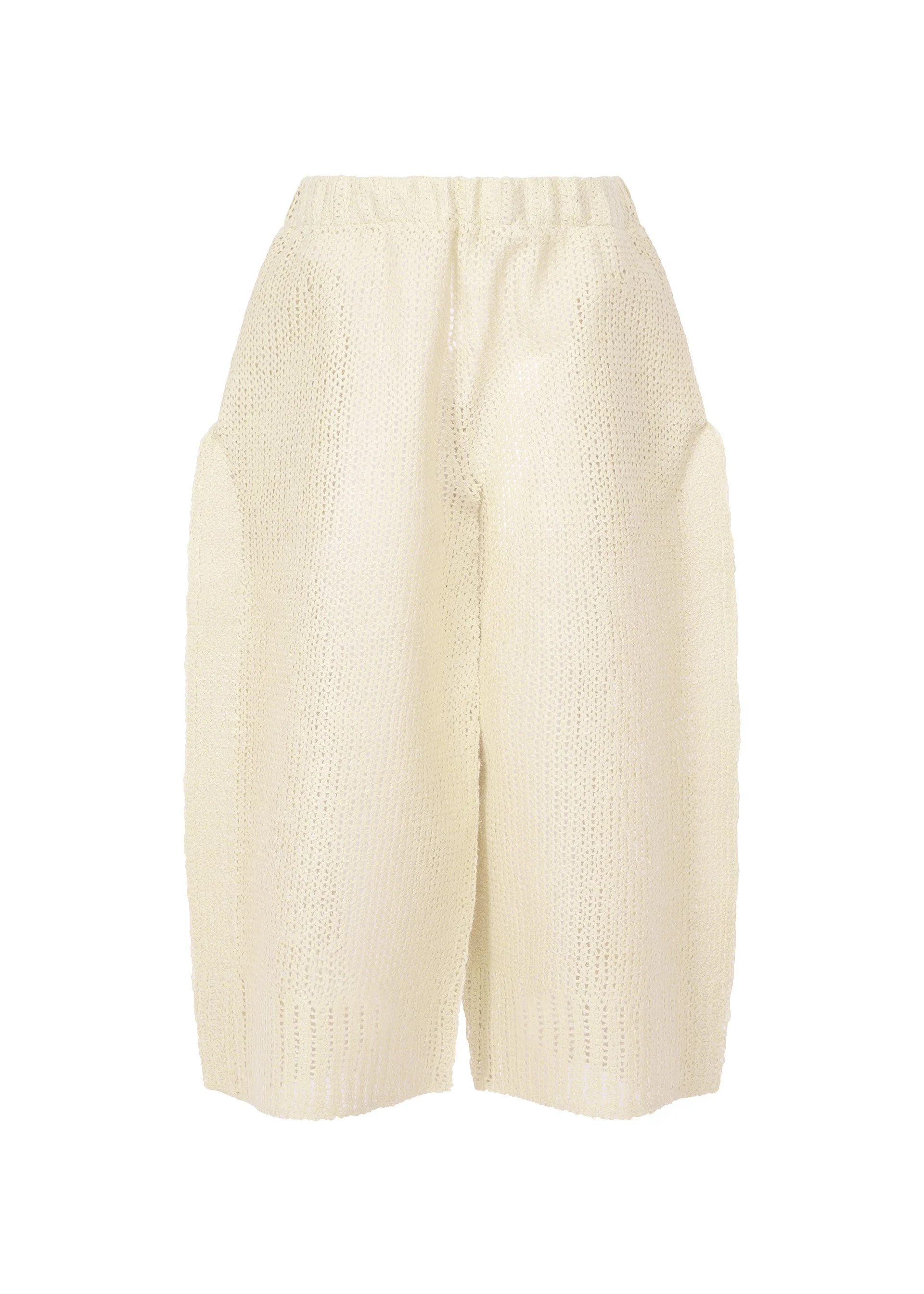 These knit pants are characterized by their dynamic silhouette created through flat pressing. By pressing thermoplastic synthetic fibers with a wool and alpaca blend yarn, a crisp, rigid texture and subtle sheen not typically found in knitwear are achieved. Similar to sandwiching fillings in a panini, a mold is placed inside the garment during pressing, and the edges where nothing is sandwiched are firmly fused as the knit fabric meets. Due to the manufacturing process and characteristics of the material, the texture and fit vary from item to item. Please note this in advance. Product Information Material: 62% wool, 27% alpaca, 11% polyester. Made in Japan. Waist specifications:rubber Pocket (position):Front and back, both sides