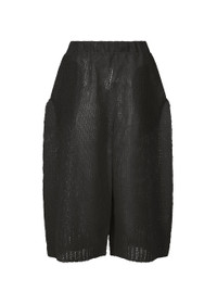 These knit pants are characterized by their dynamic silhouette created through flat pressing. By pressing thermoplastic synthetic fibers with a wool and alpaca blend yarn, a crisp, rigid texture and subtle sheen not typically found in knitwear are achieved. Similar to sandwiching fillings in a panini, a mold is placed inside the garment during pressing, and the edges where nothing is sandwiched are firmly fused as the knit fabric meets. Due to the manufacturing process and characteristics of the material, the texture and fit vary from item to item. Please note this in advance. Product Information Material: 62% wool, 27% alpaca, 11% polyester. Made in Japan. Waist specifications:rubber Pocket (position):Front and back, both sides