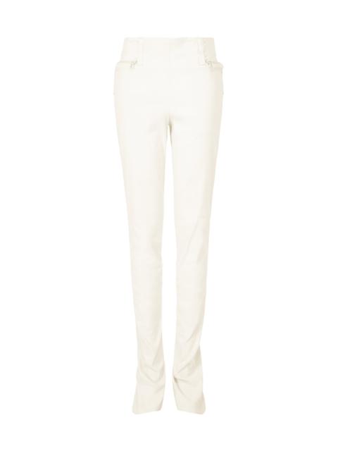 These pants feature a unique design with attached shoe covers. Made with stretch material using Japanese washi paper and cotton, the dobby weaving recreates the characteristic texture of paper, creating fresh fabric volume. Product Information Material: 41% non-classified fiber (washi paper), 36% nylon, 14% cotton, 9% polyurethane. Made in Japan. Waist specifications:belt loop Pocket (position):Front and back, both sides others:Zipper (back)