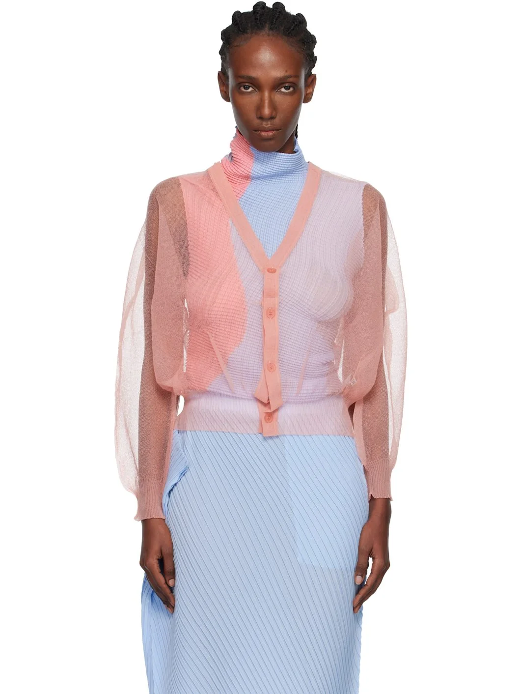 Sheer knit nylon cardigan. · Rib-knit Y-neck, hem, and cuffs · Balloon sleeves Supplier color: Coral 100% nylon. Made in Japan 252809F095007
