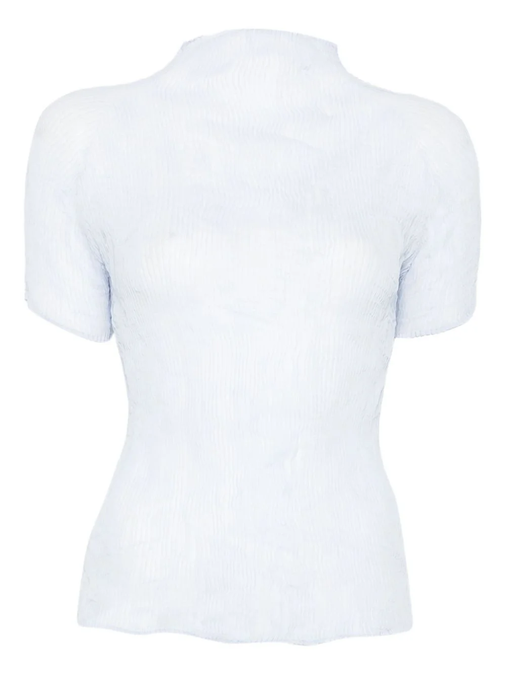 pleated high-neck blouse Highlights - Light blue - Pleated texture - Short sleeves - High neck - Semi-sheer Imported Composition Polyester 100% SIZE & FIT Model measurements Height 5 ft 10 in(1.78 m) Bust/Chest 33.46 in(85 cm) Hips 36.22 in(92 cm) Waist 23.22 in(59 cm) Washing instructions Machine Wash