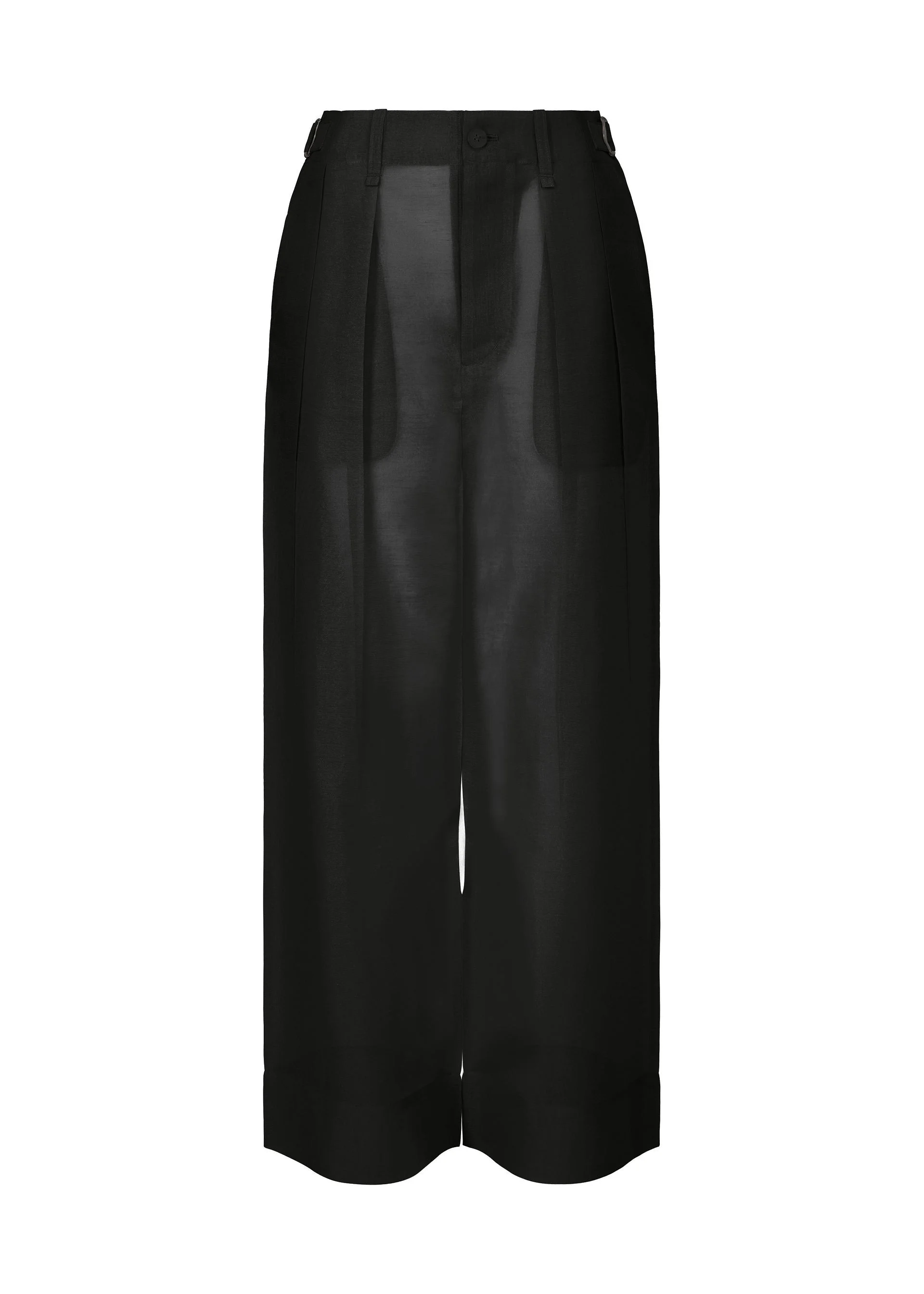 These pants are characterized by their bold form created by pressing them after adding folds. The sheer, moderately taut fabric is made by alternating fine, sheer thread with polyester and ramie spun thread. Although the fabric has a prominently angular appearance, its texture makes it softly skim the body when worn. The pants feature translucent, original buttons made by passing matching fabric inside sheer polyester buttons. Due to the manufacturing process, the texture and size of this product vary from item to item. Please note this in advance. Product Information Material: 89% polyester, 11% ramie Made in Japan Waist Specifications:Buttons / Integrated belt Front opening:Button fly Pocket (position):Front and back sides