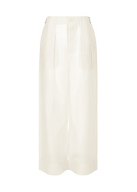 These pants are characterized by their bold form created by pressing them after adding folds. The sheer, moderately taut fabric is made by alternating fine, sheer thread with polyester and ramie spun thread. Although the fabric has a prominently angular appearance, its texture makes it softly skim the body when worn. The pants feature translucent, original buttons made by passing matching fabric inside sheer polyester buttons. Due to the manufacturing process, the texture and size of this product vary from item to item. Please note this in advance. Product Information Material: 89% polyester, 11% ramie Made in Japan Waist Specifications:Buttons / Integrated belt Front opening:Button fly Pocket (position):Front and back sides