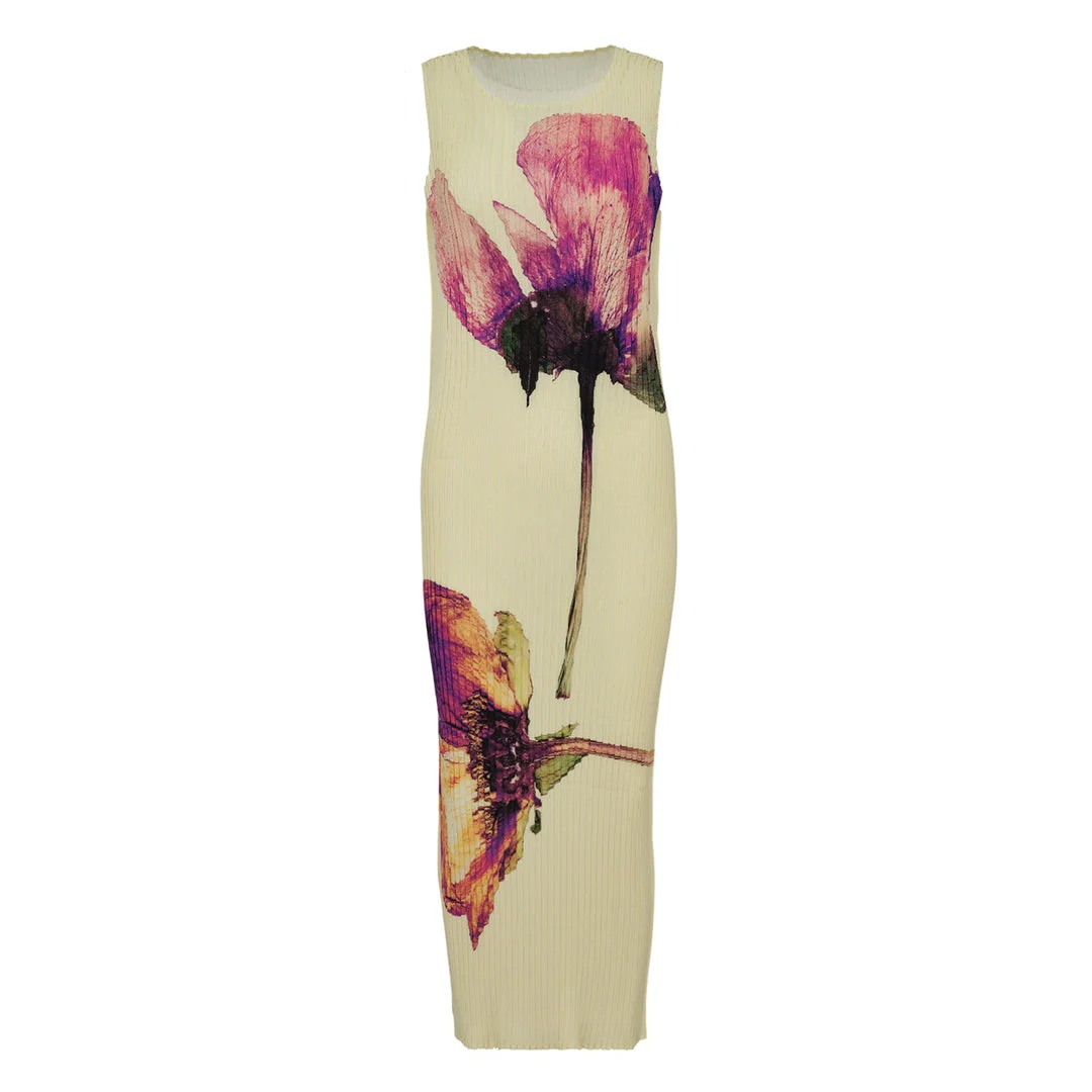 600061837YEL002 / IM56FH646/00/98/MAR - Signature PLEATS PLEASE permanent pleating - Sleeveless design - Midi length - Round neckline - Pressed flower print design - Lightweight pleated polyester construction - Machine washable - Comfortable stretch fit ISSEY MIYAKE Pressed Flora Pleats Pleated Dress delivers innovative Japanese design with signature pleating technology and artistic floral motifs. Crafted from lightweight pleated polyester in cream with vibrant purple and pink pressed flower prints, featuring the brand's revolutionary permanent pleating technique. The sleeveless midi silhouette and botanical artwork create a wearable piece of contemporary art.