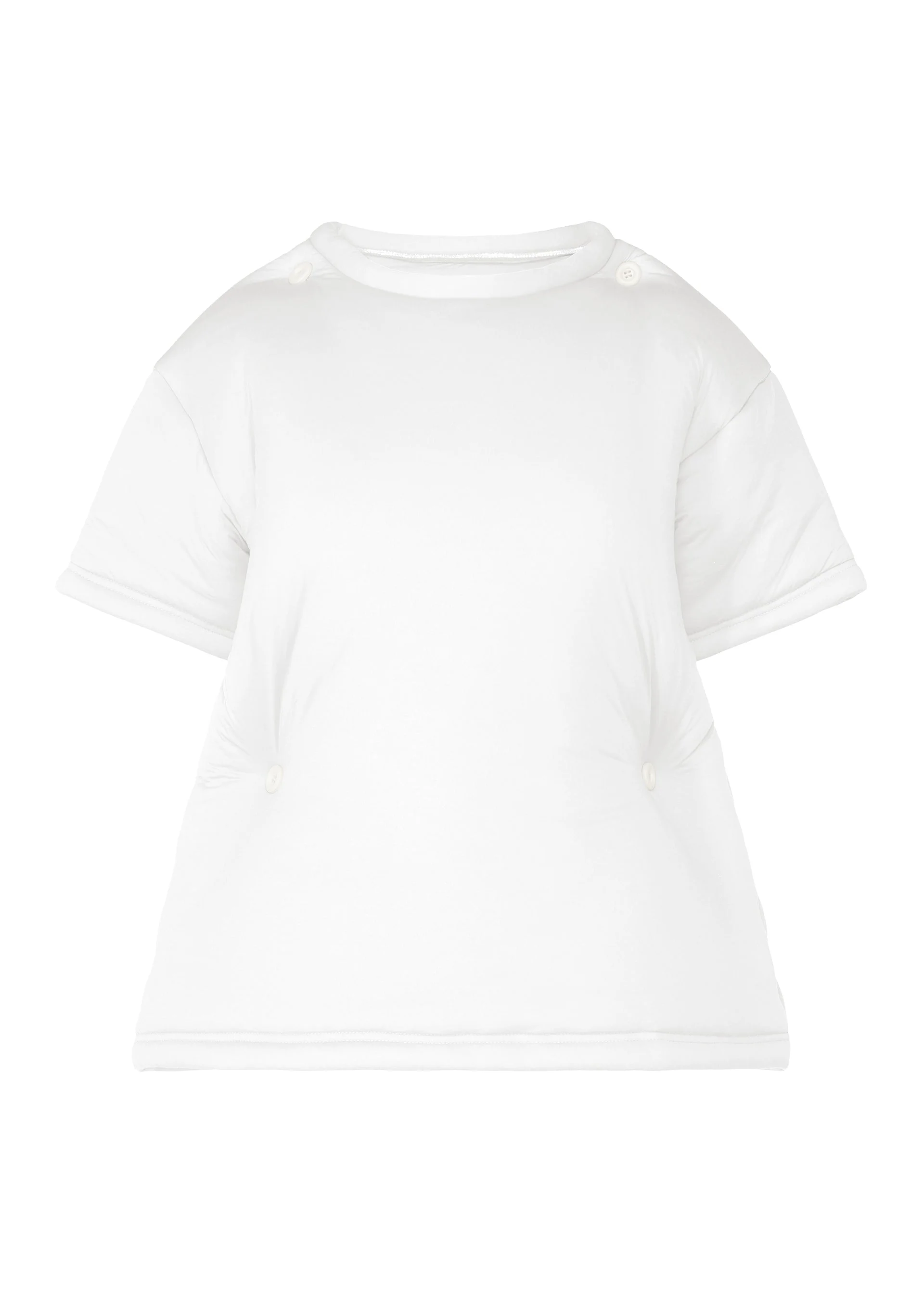 This round-neck, short-sleeved top features inner padding. The unique, billowing form and soft, comfortable feel are achieved by inserting a sheet of padding between layers of ultra-high-density (46-gauge) stretch jersey material. While maintaining a basic silhouette, the added padding gives the top a distinctive presence. Product Information Material: 90% nylon, 10% polyurethane Lining: 90% nylon, 10% polyurethane Filling: 100% polyester Made in Japan Neckline / Collar:crew neck others:Buttons (both shoulders)