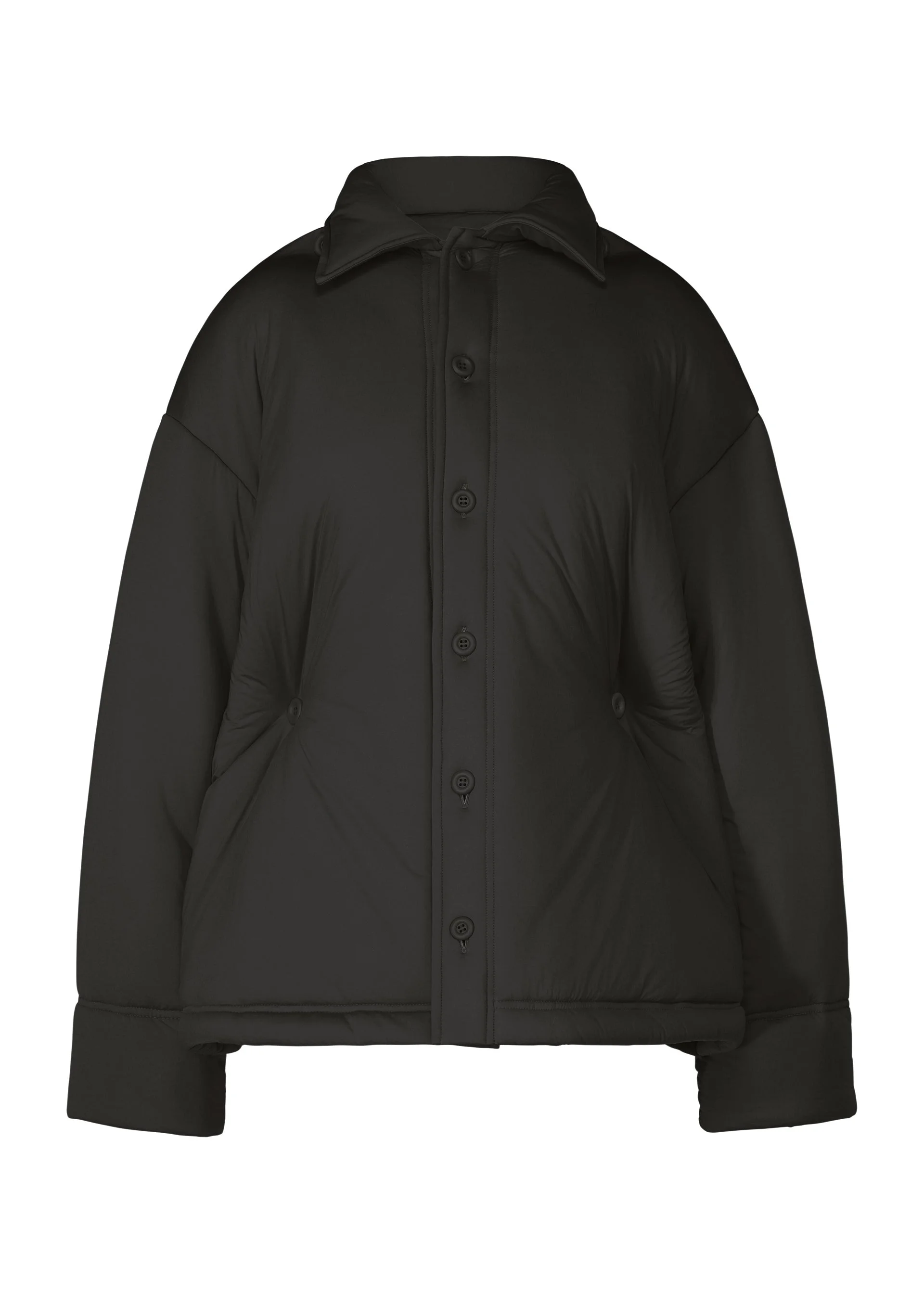 This jacket features inner padding. The unique, billowing form and soft, comfortable feel are achieved by inserting a sheet of padding between layers of ultra-high-density (46-gauge) stretch jersey material. While maintaining a basic silhouette, the added padding gives the jacket a distinctive presence. Product Information Material: 90% nylon, 10% polyurethane Lining: 90% nylon, 10% polyurethane Filling: 100% polyester Made in Japan Neckline / Collar:Regular Color Front opening:button others:Buttons (both shoulders)