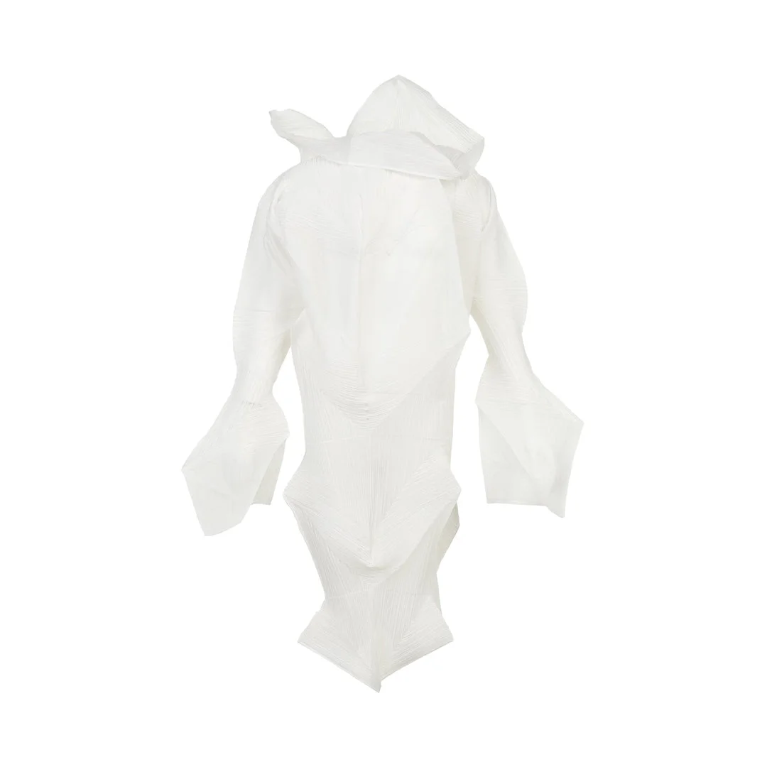 300048004WHT-02 / S5IM56FH633/00/05/JUN - High neckline with tie detail - Long sleeves with dramatic bell cuffs - Fitted bodice with structured waist - Signature pleated construction - Technical fabric composition - Form-fitting silhouette - Machine washable pleating technology The ISSEY MIYAKE Shade And Shaded Dress delivers architectural silhouette through innovative pleating technology and sophisticated draping. Crafted from the brand's signature technical fabric in pristine white, featuring dynamic texture variations that create visual depth and movement. The structured construction and fluid silhouette embody ISSEY MIYAKE's philosophy of combining technology with wearable art.