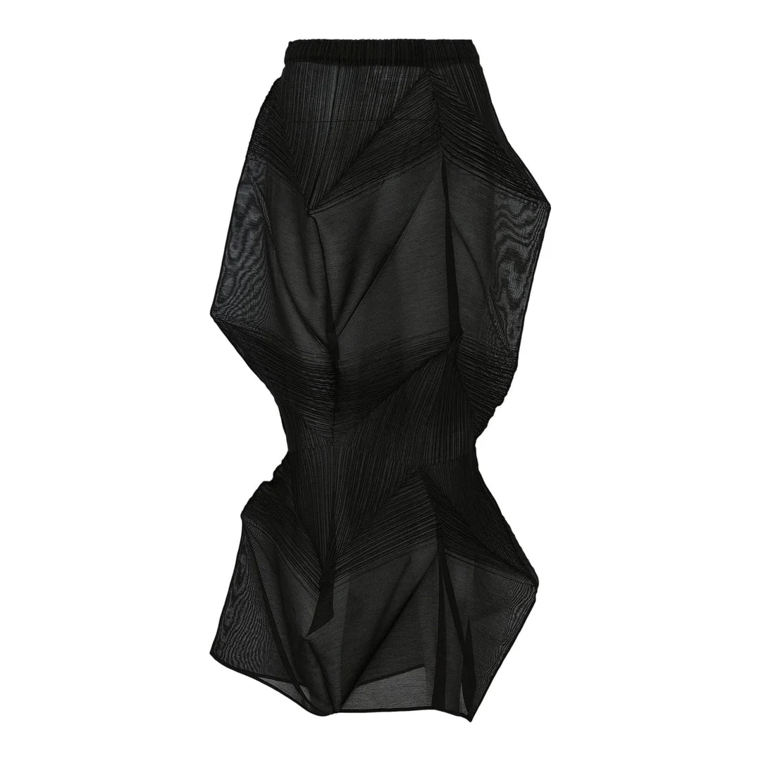 600068159BLK002 / IM56FG635/00/15/JUN - Signature micro-pleating throughout - Elasticated waistband - Asymmetrical geometric silhouette - Technical pleated fabric construction - Machine washable pleats - Midi length design - Sculptural dimensional shape ISSEY MIYAKE Shade And Shaded Pleated Skirt delivers innovative design with architectural pleating and sculptural silhouette. Crafted from technical pleated fabric in deep black, featuring the brand's signature micro-pleating technique that maintains structure while allowing fluid movement. The geometric construction and avant-garde asymmetrical shape exemplify ISSEY MIYAKE's pioneering approach to contemporary fashion.