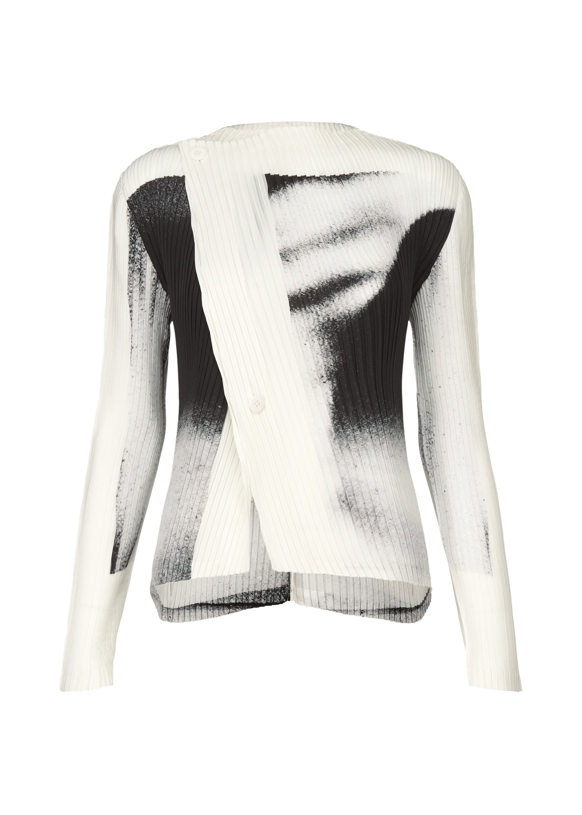 This long-sleeved cardigan is characterized by its pattern created using original monochrome photographs. Designed by conceptualizing a single quadrilateral piece of cloth, it is made from polyester crepe de Chine, which has a soft texture and beautiful flowy feel. The original pattern was applied through inkjet printing. Inspired by printed photographs on paper, the pattern deliberately incorporates white space. Due to the manufacturing process, the texture of this product varies from item to item. Please note this in advance. Product Information Material: 100% polyester Country of origin: Japan neckline/collar:No color Front opening:button