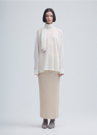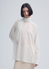 SHEER WOOL is a top series featuring delicate and subtly transparent woven fabric. This long sleeve shirt has a relaxed fit and a button down closure at the back. It includes an elegant high collar that can be wrapped around the neck like a scarf. Product Code: IM48-FJ001 Material: 57% Wool, 43% Polyester (Woven) Care: Hand wash cold. Only non-chlorine bleach, when needed. Do not tumble dry. Line dry in the shade. Warm iron. Dryclean any solvent, short cycle.