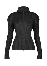 This zip-up cardigan features pleated fabric with the beautiful sheen of refined satin. Although it is made from polyester fiber, it is characterized by its delicate, glossy texture, made by mimicking the fiber structure of silk using cutting-edge technology. It is pleated twice and designed to have a simple silhouette that moderately hugs the body. The size of this product varies slightly from item to item. Please note this in advance. Product Information Material: 100% polyester Made in Japan Neckline / Collar:High neck Front opening:double zipper