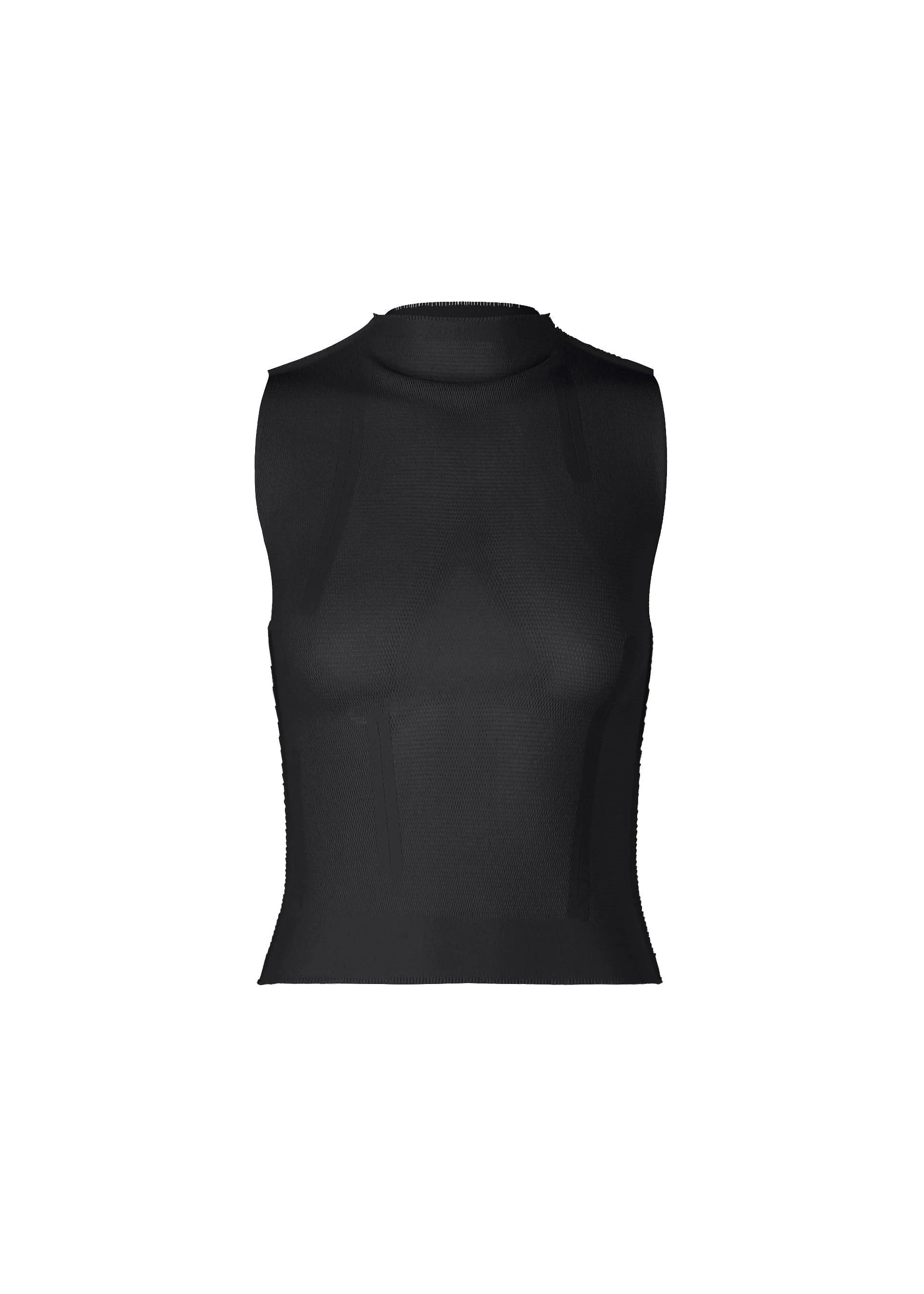 This mock-neck, sleeveless top is characterized by cut lines placed throughout the delicate mesh knitted fabric. The wearer can cut along these lines to customize the garment to their preference. Just as plants sprouting through cracks in concrete evoke a sense of powerful vitality, the sense of vitality in clothing peeks through slits created by cutting to reveal the clothing worn underneath. In addition to conceptual layered styling, this top is also ideal as innerwear to showcase its body-hugging silhouette. The size of this product varies slightly from item to item. Please note this in advance. Product Information Material: 95% Nylon, 5% Polyurethane Made In Japan Neckline / collar:Mock neck