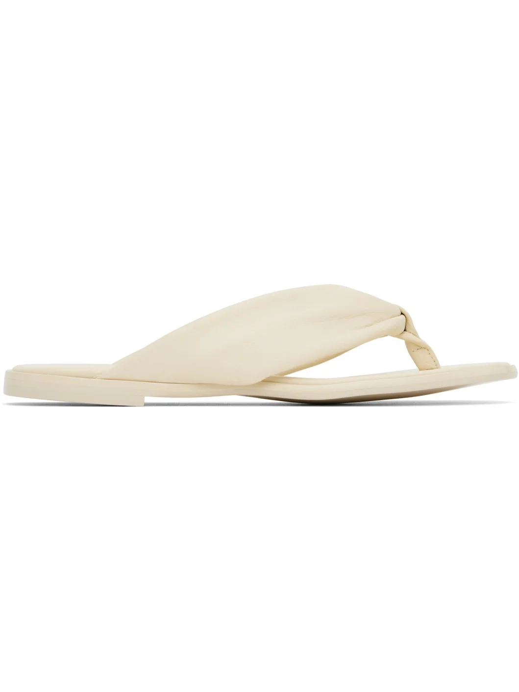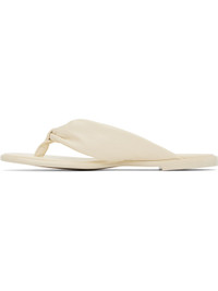 Grained leather flat sandals in off-white. · Open toe · Twisted thong-style strap at vamp · Logo embossed at padded footbed · Faux-leather sole Part of the exclusive SSENSE Bridal capsule. Supplier color: Kouzo ivory Upper: leather. Sole: synthetic. Made in Japan 252809F124000