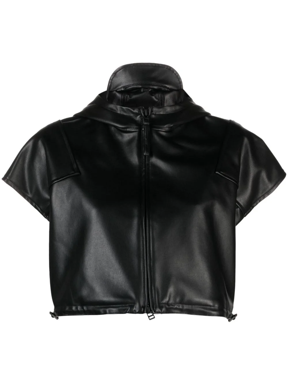 Straight Seams hooded cropped jacket Highlights - Black - Artificial leather - Classic hood - Front two-way zip fastening - Short sleeves - Cropped - Drawstring hem Imported Composition Lining: Polyester 100% Outer: Artificial Leather 100% Washing instructions Hand Wash