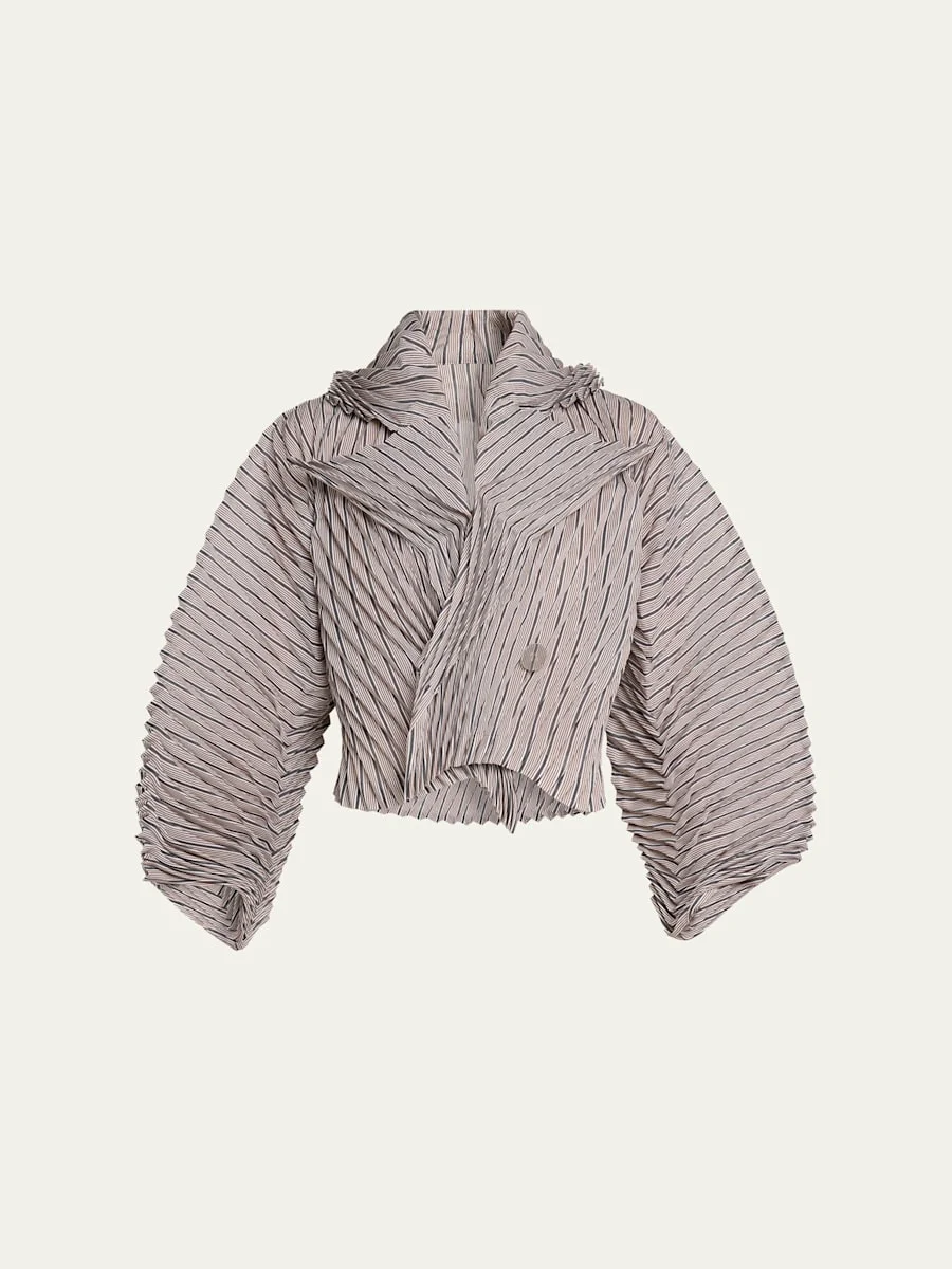 Crafted from pleated stripe polyester, this jacket from Issey Miyake puts dynamic movement into the spotlight with its voluminous curved sleeves Notch lapels; doublebreasted front Curved long sleeves Slim fit Cropped length Button front closure Polyester Made in Japan "SIZE amp; FITModel measurements: 5'10"" tall Model is wearing a US size 4/Small