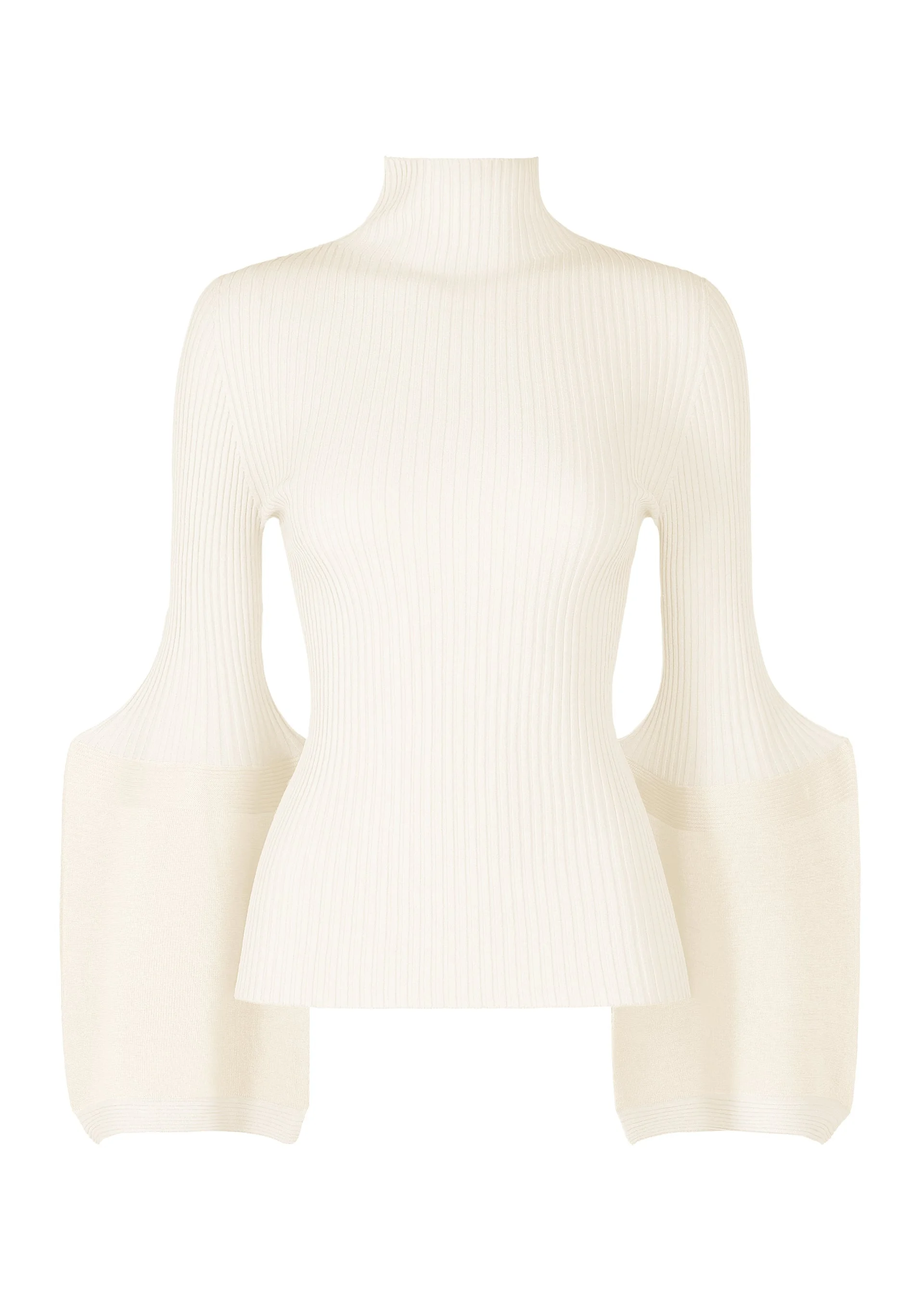 This high-neck knit top is characterized by the contrast between parts that separate from and conform to the body. The flat knitted sections use fusing thread and are hardened with heat to create a silhouette that separates from the body, while thin ribs are partially combined to create sections that fit the body. This knit series has a thin, pleasant-to-touch texture that's easy to wear from warmer seasons. Product Information Material: 45% rayon, 20% polyester, 18% nylon, 17% cupra. Made in Japan. Neckline / Collar:High neck