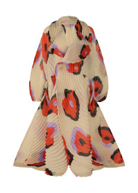 This pleated coat is designed with large hand-drawn floral patterns that create a rhythmic and cheerful impression. It is characterized by its dynamic silhouette that makes use of the flowing handmade pleats. The floral pattern, painted directly onto the fabric with fingers, is made with a Nassen print onto a beautiful material woven with threads that have a shimmering, translucent quality. The pleats bounce and sway with every step and, coupled with the patterns vigorously painted with the fingers, evoke the image of vividly blooming flowers. Due to the nature of the manufacturing process, the pattern and sizing of this product vary from item to item. Please note this in advance. Product Information Material: 100% Polyester Made In Japan Neckline / collar:With collar Front opening:Button Pocket (position):Both sides Vent (location):Center vent Accessories:Belt made from the same fabric Others:Belt loop