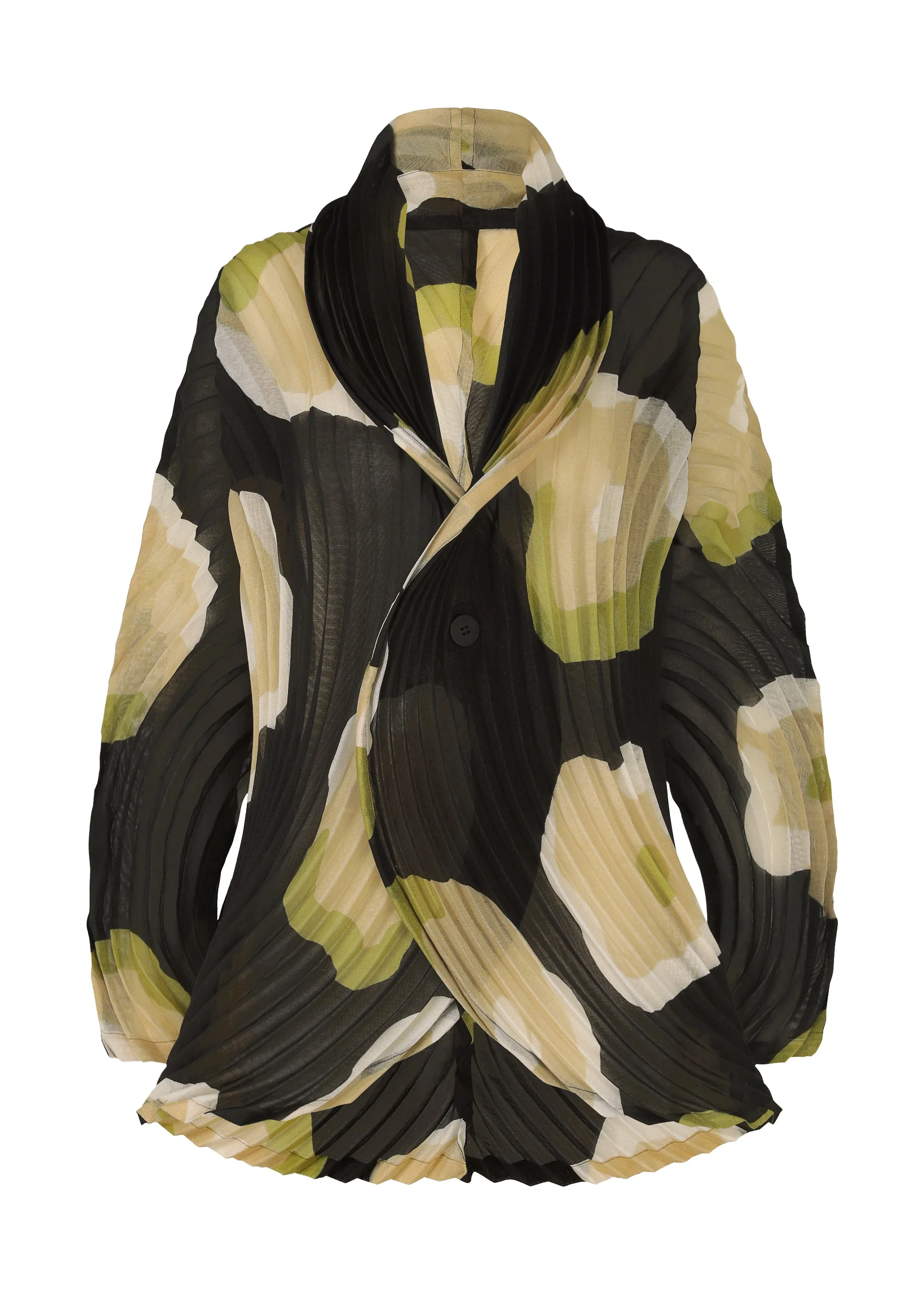 This pleated jacket is designed with large hand-drawn floral patterns that create a rhythmic and cheerful impression. It is characterized by its dynamic silhouette that makes use of the flowing handmade pleats. The floral pattern, painted directly onto the fabric with fingers, is made with a Nassen print onto a beautiful material woven with threads that have a shimmering, translucent quality. The pleats bounce and sway with every step and, coupled with the patterns vigorously painted with the fingers, evoke the image of vividly blooming flowers. Due to the nature of the manufacturing process, the pattern and sizing of this product vary from item to item. Please note this in advance. Product Information Material: 100% Polyester Made In Japan Neckline / collar:With collar Front opening:Button