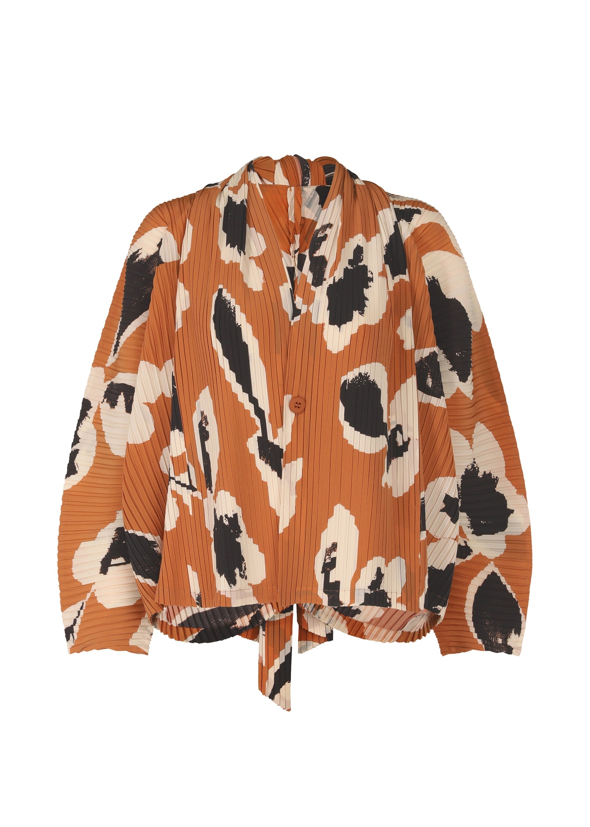 A pleated long-sleeved cardigan that uses flowers and combines them with drawings to express the vitality and strength of plants. I create a base pattern by applying paint directly to dozens of plants to create prints, or placing silkscreen gauze on top of the plants and printing them with pigment, and then add free drawings on top of that to create a sense of movement. I created a pattern. Inkjet printing is applied to recycled polyester fabric, creating a design that wraps around the body based on the image of "wearing it." This product is different in size and pattern. Thank you for your understanding.